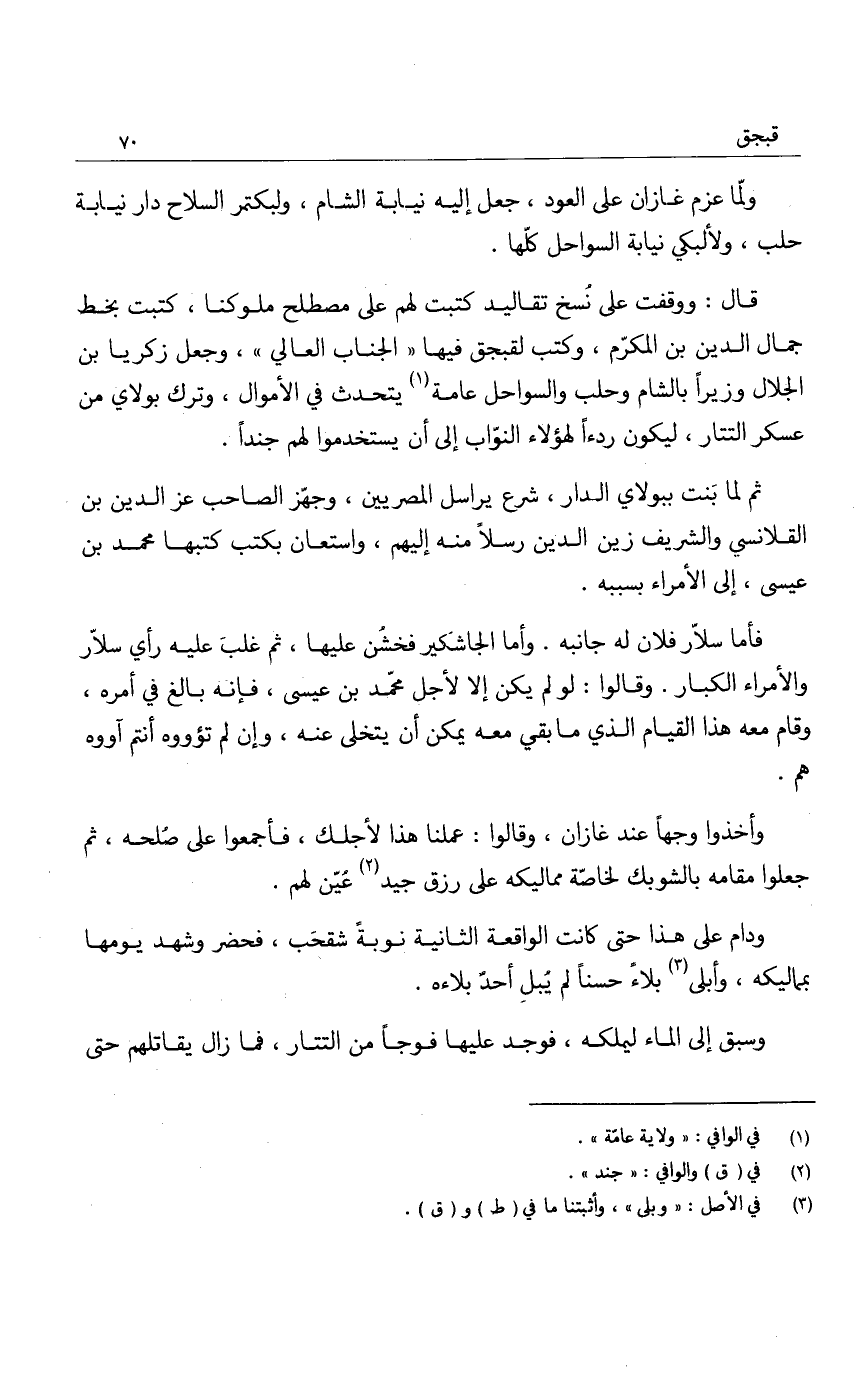 قال: ووقفت على نسخ تقاليد كتبت لهم على مصطلح ملوكنا، كتبت بخط جمال الدين بن المكرم، وكتب لقبجق فيها " الجناب العالي "، وجعل زكريا بن الجلال وزيراً بالشام وحلب والسواحل عامة يتحدث في الأموال، وترك بولاي من عسكر التتار، ليكون ردءاً لهؤلاء النواب إلى أن يستخدموا لهم جنداً.