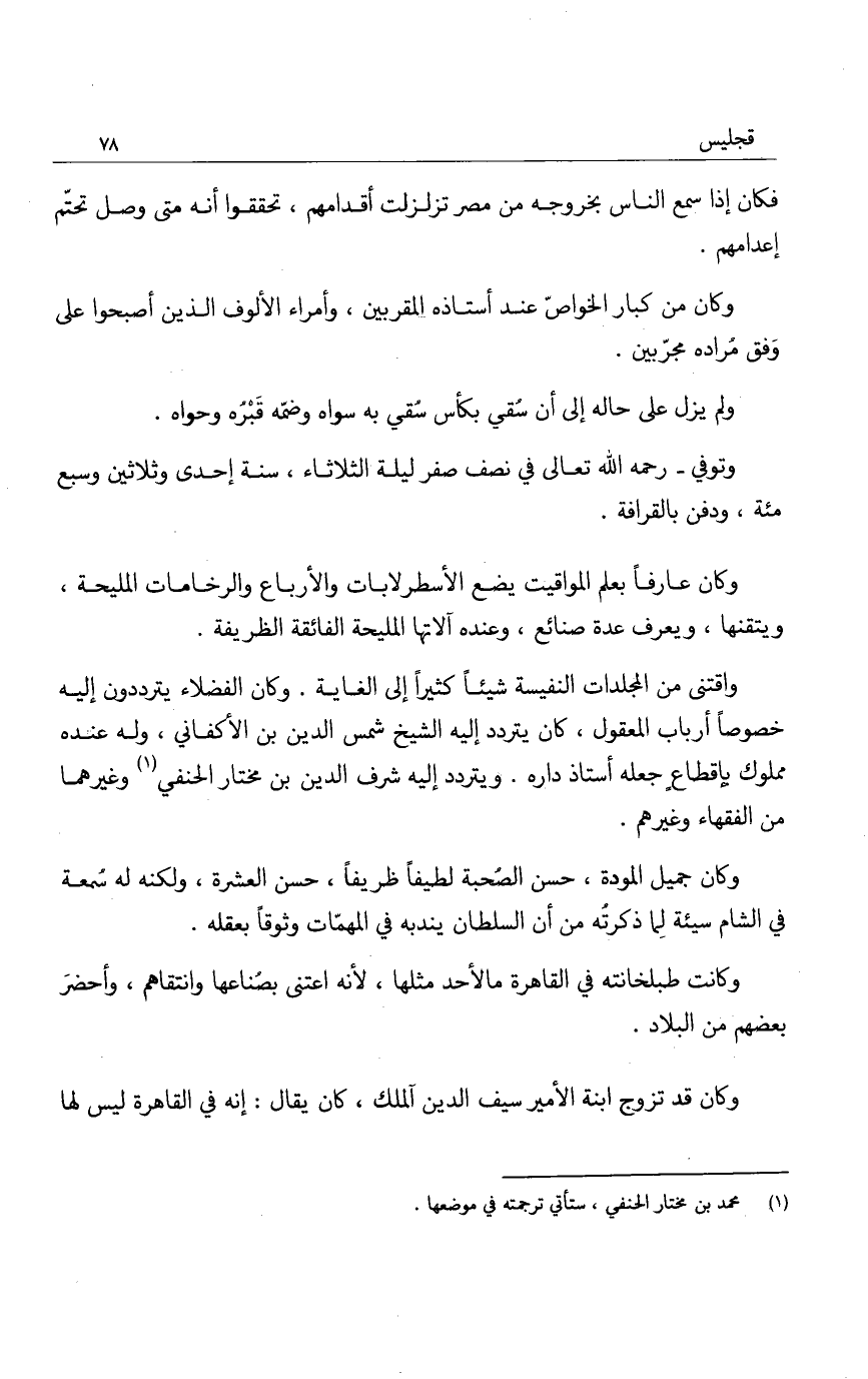 واقتنى من المجلدات النفيسة شيئاً كثيراً إلى الغاية. وكان الفضلاء يترددون إليه خصوصاً أرباب المعقول، كان يتردد إليه الشيخ شمس الدين بن الأكفاني، وله عنده مملوك بإقطاع جعله أستاذ داره. ويتردد إليه شرف الدين بن مختار الحنفي وغيرهما من الفقهاء وغيرهم.