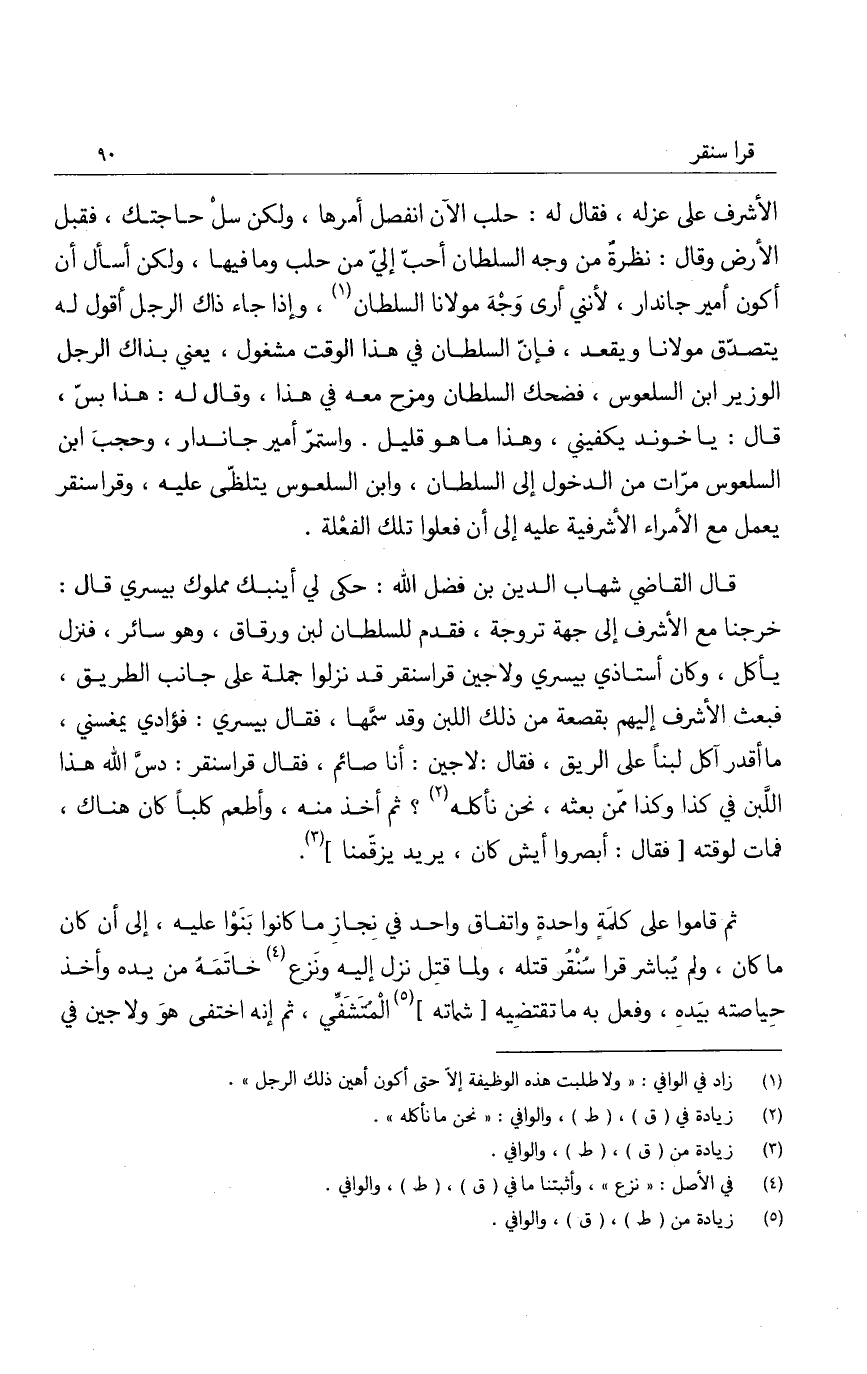 الأشرف على عزله، فقال له: حلب الآن انفصل أمرها، ولكن سل حاجتك، فقبل الأرض وقال: نظرة من وجه السلطان أحب إلي من حلب وما فيها، ولكن أسأل أن أكون أمير جاندار، لأنني أرى وجه مولانا السلطان، وإذا جاء ذاك الرجل أقول له يتصدق مولانا ويقعد، فإن السلطان في هذا الوقت مشغول، يعني بذاك الرجل الوزير ابن السلعوس، فضحك السلطان ومزح معه في هذا، وقال له: هذا بس، قال: يا خوند يكفيني، وهذا ما هو قليل. واستمر أمير جاندار، وحجب ابن السلعوس مرات من الدخول إلى السلطان، وابن السلعوس يتلظى عليه، وقراسنقر يعمل مع الأمراء الأشرفية عليه إلى أن فعلوا تلك الفعلة.