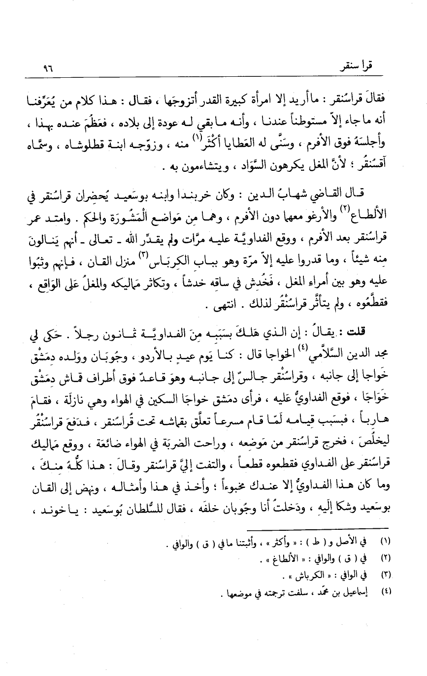 قلت: يقال: إن الذي هلك بسببه من الفداوية ثمانون رجلاً. حكى لي مجد الدين السلامي الخواجا قال: كنا يوم عيد بالأردو، وجوبان وولده دمشق خواجا إلى جانبه، وقراسنقر جالس إلى جانبه وهو قاعد فوق أطراف قماش دمشق خواجا، فوقع الفداوي عليه، فرأى دمشق خواجا السكين في الهواء وهي نازلة، فقام هارباً، فبسبب قيامه لما قام مسرعاً تعلق بقماشه تحت قراسنقر، فدفع قراسنقر ليخلص، فخرج قراسنقر من موضعه، وراحت الضربة في الهواء ضائعة، ووقع مماليك قراسنقر على الفداوي فقطعوه قطعاً، والتفت إلي قراسنقر وقال: هذا كله منك، وما كان هذا الفداوي إلا عندك مخبوءاً؛ وأخذ في هذا وأمثاله، ونهض إلى القان بوسعيد وشكا إليه، ودخلت أنا وجوبان خلفه، فقال للسلطان بوسعيد: يا خوند،