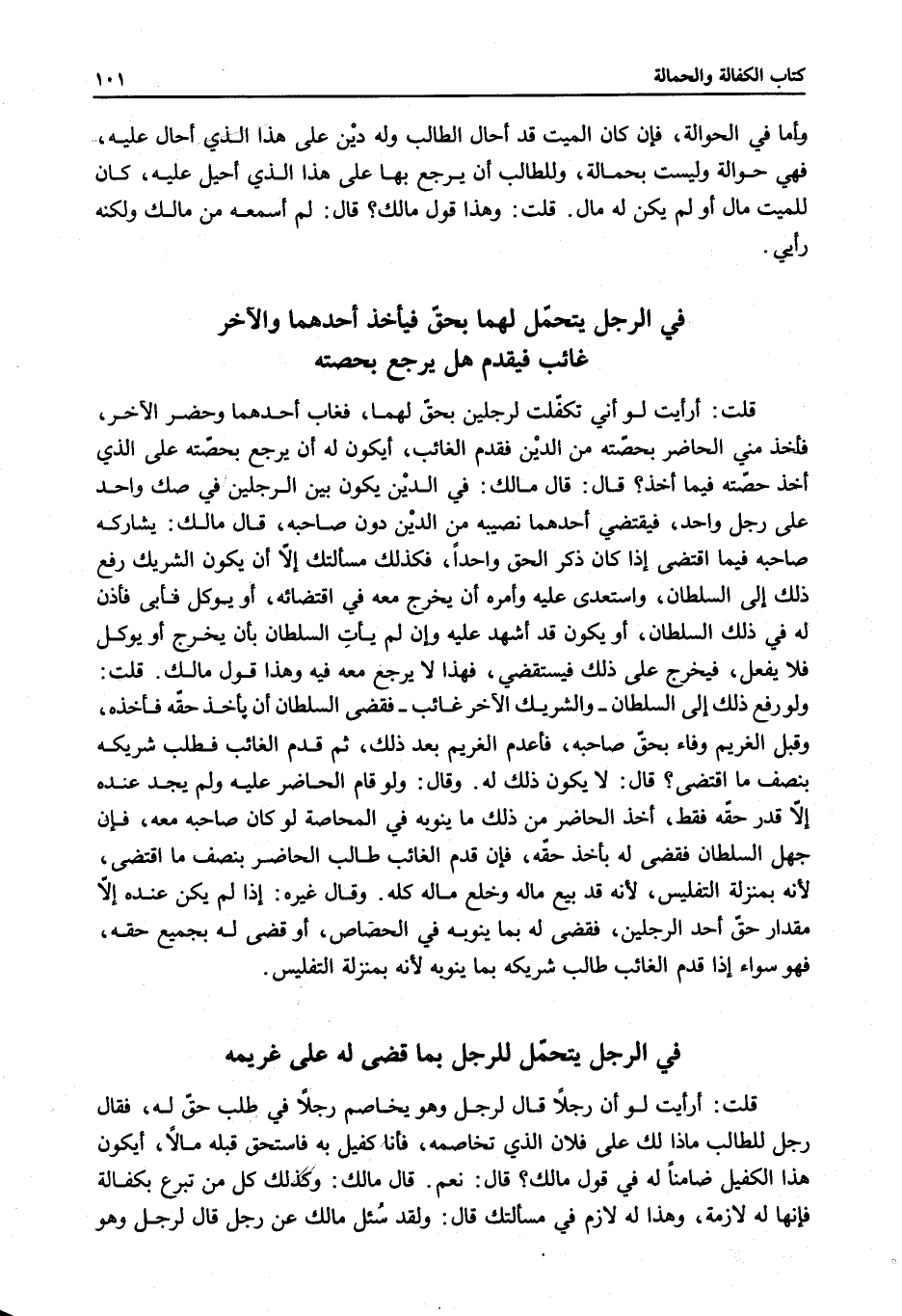 ِ قُلْتُ: أَرَأَيْتَ لَوْ أَنَّ رَجُلًا قَالَ لِرَجُلٍ وَهُوَ يُخَاصِم رَجُلًا فِي طَلَبِ حَقٍّ لَهُ، فَقَالَ رَجُلٌ لِلطَّالِبِ مَاذَا لَكَ عَلَى فُلَانٍ الَّذِي تُخَاصِمُهُ، فَأَنَا كَفِيلٌ بِهِ فَاسْتَحَقَّ قِبَلَهُ مَالًا، أَيَكُونُ هَذَا الْكَفِيلُ ضَامِنًا لَهُ فِي قَوْلِ مَالِكٍ؟