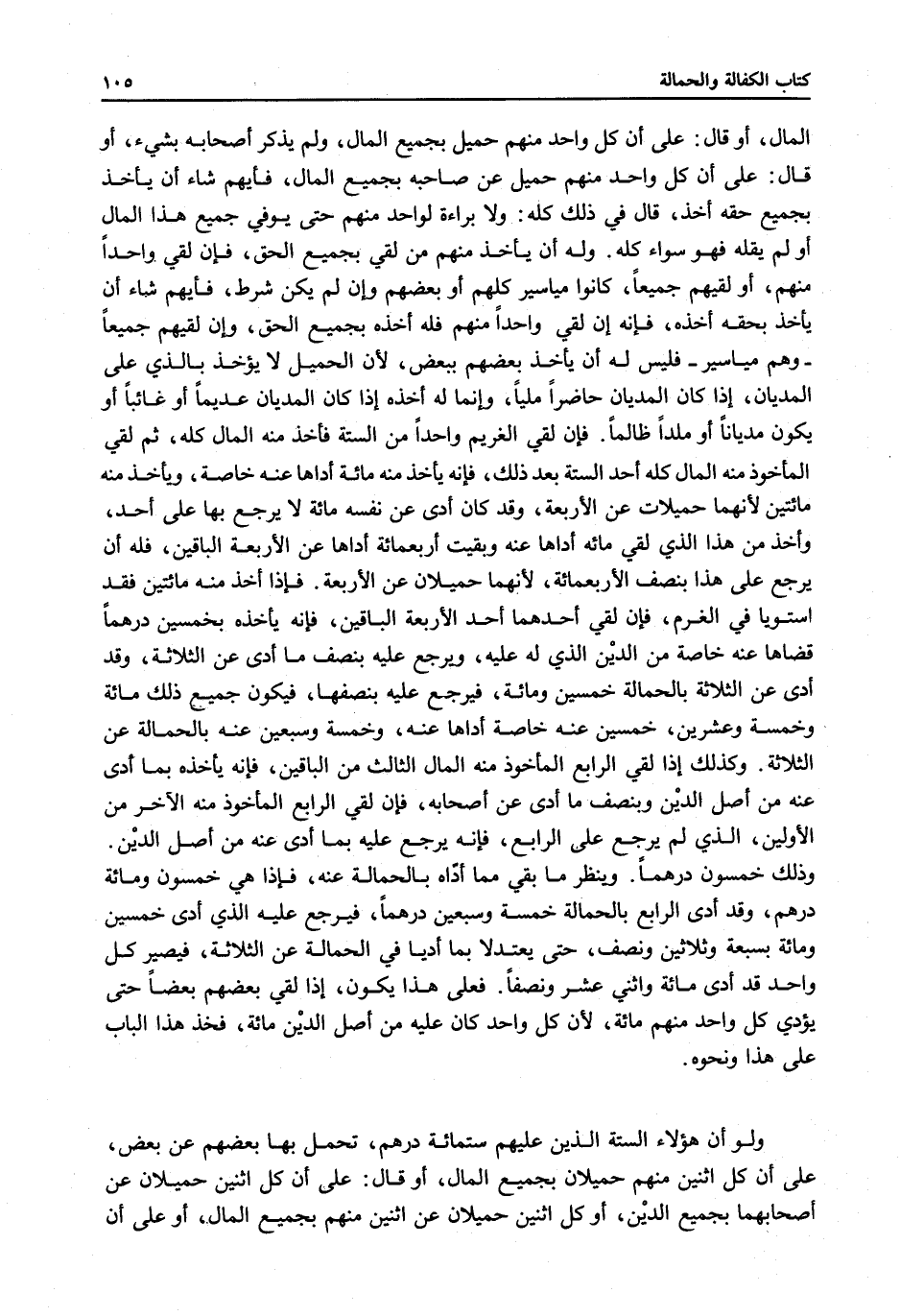 وَكَذَلِكَ إذَا لَقِيَ الرَّابِعُ الْمَأْخُوذُ مِنْهُ الْمَالُ الثَّالِثَ مِنْ الْبَاقِينَ، فَإِنَّهُ يَأْخُذُهُ بِمَا أَدَّى عَنْهُ مِنْ أَصْلِ الدَّيْنِ وَبِنِصْفِ مَا أَدَّى عَنْ أَصْحَابِهِ، فَإِنَّ لَقِيَ الرَّابِعُ الْمَأْخُوذُ مِنْهُ الْآخَرَ مِنْ الْأَوَّلَيْنِ، الَّذِي لَمْ يَرْجِعْ عَلَى الرَّابِعِ؛ فَإِنَّهُ يَرْجِعُ عَلَيْهِ بِمَا أَدَّى عَنْهُ مِنْ أَصْلِ الدَّيْنِ. وَذَلِكَ خَمْسُونَ دِرْهَمًا. وَيُنْظَرُ مَا بَقِيَ مِمَّا أَدَّاهُ بِالْحَمَالَةِ عَنْهُ، فَإِذَا هِيَ خَمْسُونَ وَمِائَةُ دِرْهَمٍ، وَقَدْ أَدَّى الرَّابِعُ بِالْحَمَالَةِ خَمْسَةً وَسَبْعِينَ دِرْهَمًا، فَيَرْجِعُ عَلَيْهِ الَّذِي أَدَّى خَمْسِينَ وَمِائَةً بِسَبْعَةٍ وَثَلَاثِينَ وَنِصْفٍ، حَتَّى يَعْتَدِلَا بِمَا أَدَّيَا فِي الْحَمَالَةِ عَنْ الثَّلَاثَةِ، فَيَصِيرُ كُلُّ وَاحِدٍ قَدْ أَدَّى مِائَةً وَاثْنَيْ عَشَرَ وَنِصْفًا. فَعَلَى هَذَا يَكُونُ، إذَا لَقِيَ بَعْضُهُمْ بَعْضًا حَتَّى يُؤَدِّيَ كُلُّ وَاحِدٍ مِنْهُمْ مِائَةً؛ لِأَنَّ كُلَّ وَاحِدٍ كَانَ عَلَيْهِ مِنْ أَصْلِ الدَّيْنِ مِائَةٌ، فَخُذْ هَذَا الْبَابَ عَلَى هَذَا وَنَحْوِهِ. وَلَوْ أَنَّ هَؤُلَاءِ السِّتَّةَ الَّذِينَ عَلَيْهِمْ سِتُّمِائَةِ دِرْهَمٍ. تَحَمَّلَ بِهَا بَعْضُهُمْ عَنْ بَعْضٍ. عَلَى أَنَّ كُلَّ اثْنَيْنِ مِنْهُمْ حَمِيلَانِ بِجَمِيعِ الْمَالِ، أَوْ قَالَ: عَلَى أَنَّ كُلَّ اثْنَيْنِ حَمِيلَانِ عَنْ أَصْحَابِهِمَا بِجَمِيعِ الدَّيْنِ، أَوْ كُلَّ اثْنَيْنِ حَمِيلَانِ عَنْ اثْنَيْنِ مِنْهُمْ بِجَمِيعِ الْمَالِ، أَوْ عَلَى أَنَّ