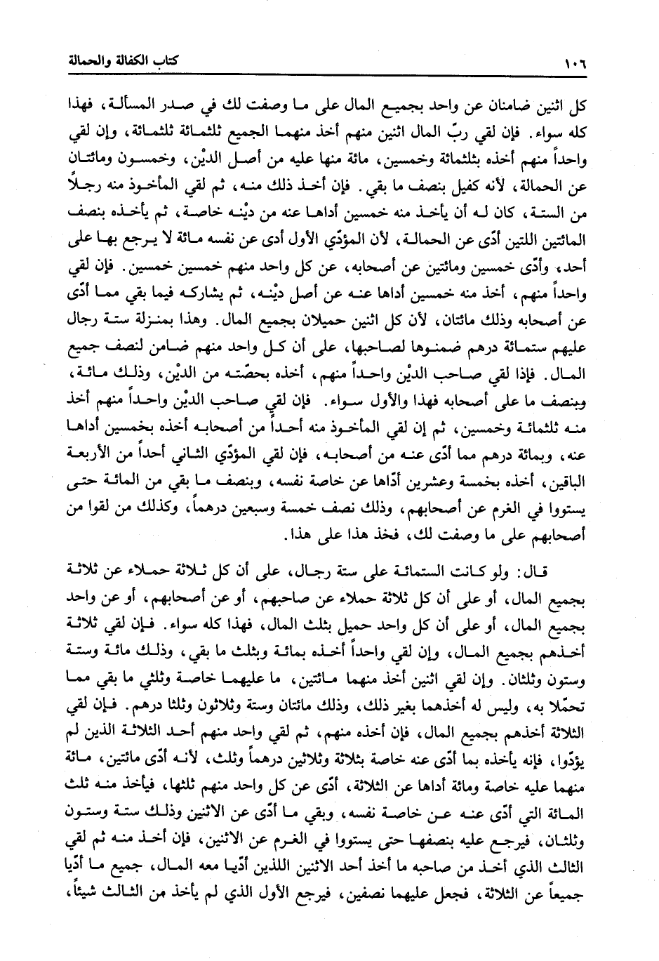 قَالَ: وَلَوْ كَانَتْ السِّتُّمِائَةِ عَلَى سِتَّةِ رِجَال. عَلَى أَنَّ كُلَّ ثَلَاثَةٍ حِمْلًا عَنْ ثَلَاثَةٍ بِجَمِيعِ الْمَالِ، أَوْ عَلَى أَنَّ كُلَّ ثَلَاثَةٍ حُمَلَاءُ عَنْ صَاحِبِهِمْ، أَوْ عَنْ أَصْحَابِهِمْ، أَوْ عَنْ وَاحِدٍ بِجَمِيعِ الْمَالِ، أَوْ عَلَى أَنَّ كُلَّ وَاحِدٍ حَمِيلٌ بِثُلُثِ الْمَالِ، فَهَذَا كُلُّهُ سَوَاءٌ. فَإِنْ لَقِيَ ثَلَاثَةً أَخَذَهُمْ بِجَمِيعِ الْمَالِ، وَإِنْ لَقِيَ وَاحِدًا أَخَذَهُ بِمِائَةٍ وَبِثُلُثِ مَا بَقِيَ، وَذَلِكَ مِائَةٌ وَسِتَّةٌ وَسِتُّونَ وَثُلُثَانِ.