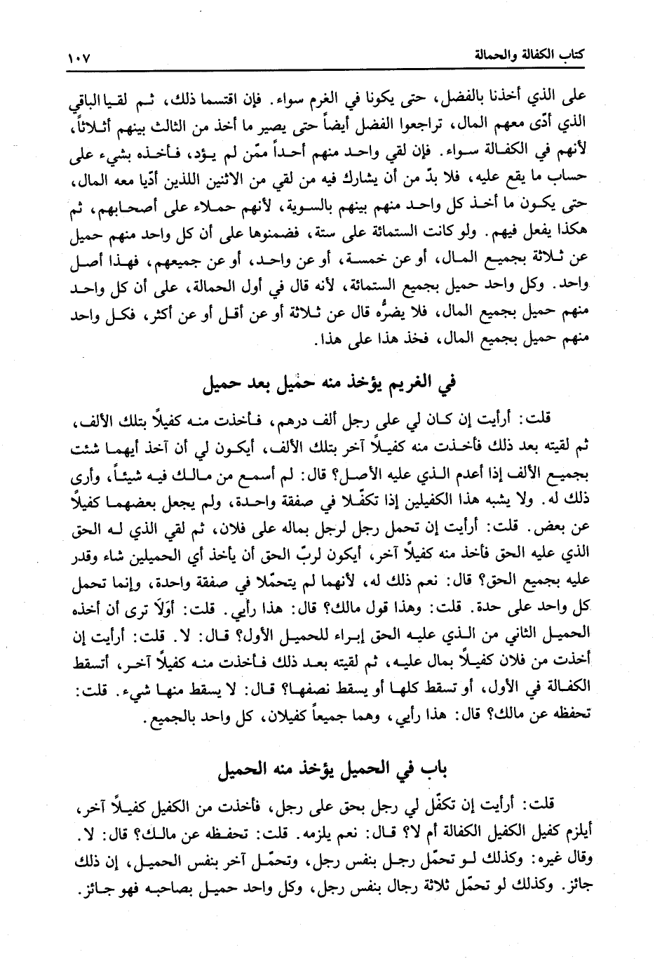 قَالَ: لَا. وَقَالَ غَيْرُهُ: وَكَذَلِكَ لَوْ تَحَمَّلَ رَجُلٌ بِنَفْسِ رَجُلٍ، وَتَحَمَّلَ آخَرُ بِنَفْسِ الْحَمِيلِ، أَنَّ ذَلِكَ جَائِزٌ. وَكَذَلِكَ لَوْ تَحَمَّلَ ثَلَاثَةُ رِجَالٍ بِنَفْسِ رَجُلٍ، وَكُلُّ وَاحِدٍ حَمِيلٌ بِصَاحِبِهِ فَهُوَ جَائِزٌ.