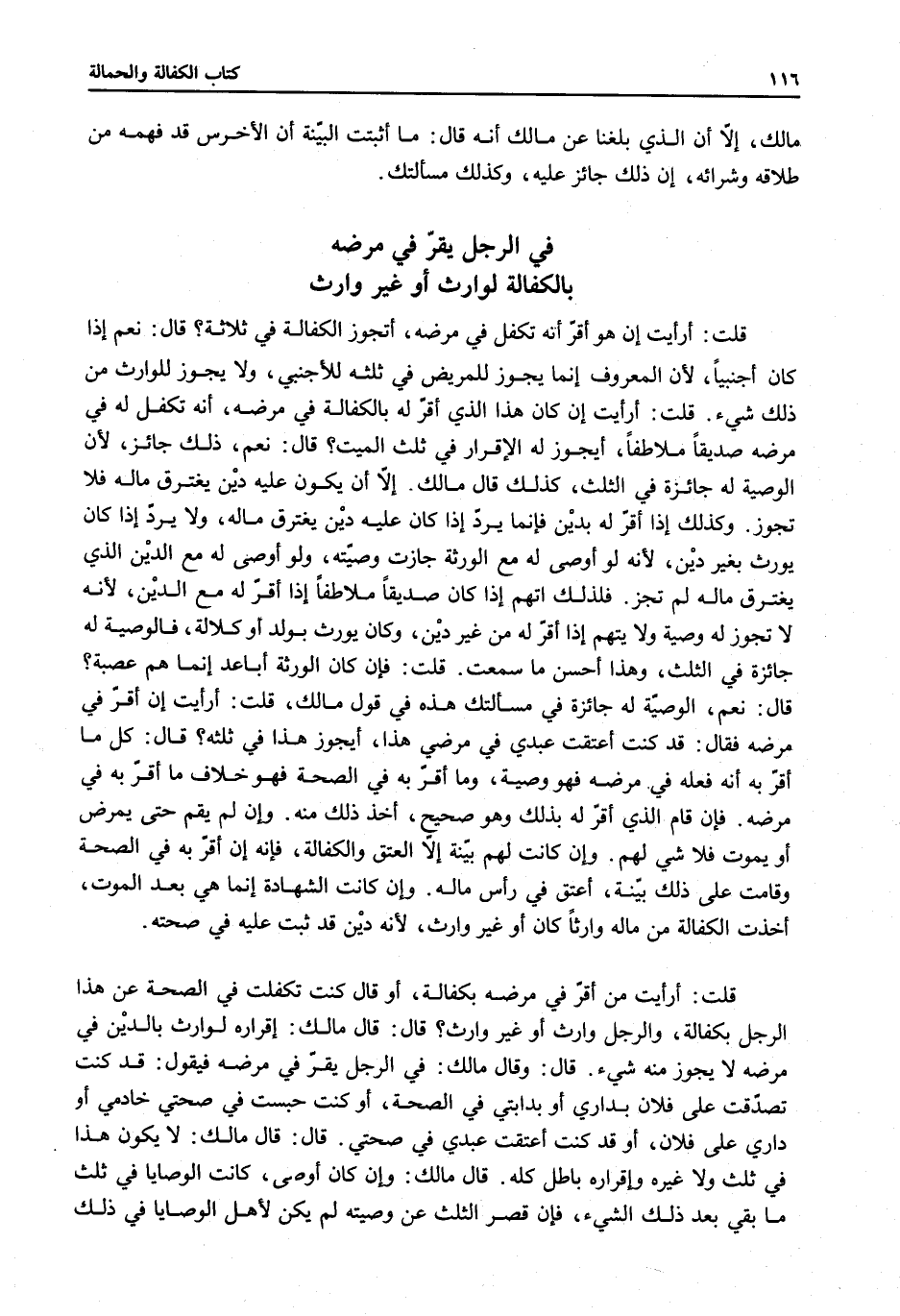قُلْتُ: أَرَأَيْتَ مَنْ أَقَرَّ فِي مَرَضِهِ بِكَفَالَةٍ، أَوْ قَالَ: كُنْتُ تَكَفَّلْت فِي الصِّحَّةِ عَنْ هَذَا الرَّجُلِ بِكَفَالَةٍ، وَالرَّجُلُ وَارِثٌ أَوْ غَيْرُ وَارِثٍ؟