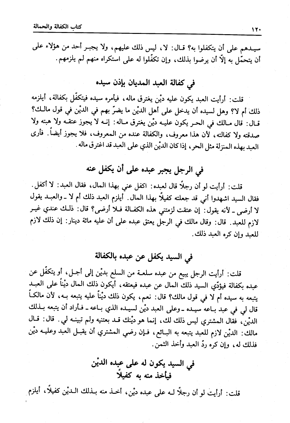 ُ قُلْتُ: أَرَأَيْتَ لَوْ أَنَّ رَجُلًا قَالَ لِعَبْدِهِ: اُكْفُلْ عَنِّي بِهَذَا الْمَالِ، فَقَالَ الْعَبْدُ: لَا أَكْفُلُ فَقَالَ السَّيِّدُ اشْهَدُوا أَنِّي قَدْ جَعَلْتَهُ كَفِيلًا بِهَذَا الْمَالِ. أَيَلْزَمُ الْعَبْدَ ذَلِكَ أَمْ لَا، وَالْعَبْدُ يَقُولُ: لَا أَرْضَى لِأَنَّهُ يَقُولُ: إنْ عَتَقْتَ لَزِمَتْنِي هَذِهِ الْكَفَالَةُ فَلَا أَرْضَى قَالَ: ذَلِكَ عِنْدِي غَيْرُ لَازِمٍ لِلْعَبْدِ.