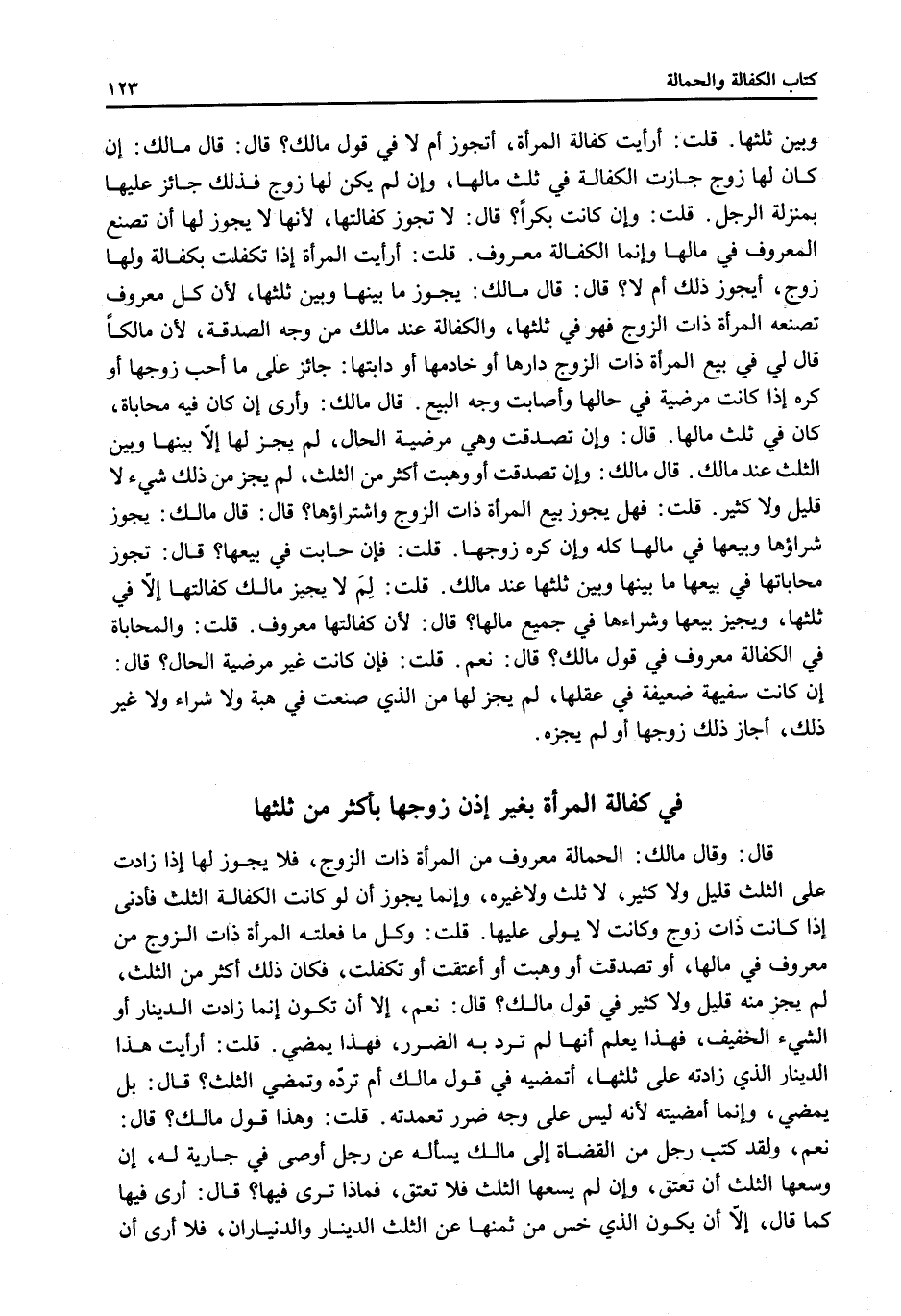 فِي كَفَالَةِ الْمَرْأَةِ بِغَيْرِ إذْنِ زَوْجِهَا بِأَكْثَرَ مِنْ ثُلُثِهَا قَالَ: وَقَالَ مَالِكٌ: الْحَمَالَةُ مَعْرُوفٌ مِنْ الْمَرْأَةِ ذَاتِ الزَّوْجِ، فَلَا يَجُوزُ لَهَا إذَا زَادَتْ عَلَى الثُّلُثِ قَلِيلٌ وَلَا كَثِيرٌ، لَا ثُلُثٌ وَلَا غَيْرُهُ، وَإِنَّمَا يَجُوزُ أَنْ لَوْ كَانَتْ الْكَفَالَةُ الثُّلُثَ فَأَدْنَى إذَا كَانَتْ ذَاتَ زَوْجٍ وَكَانَتْ لَا يُوَلَّى عَلَيْهَا.