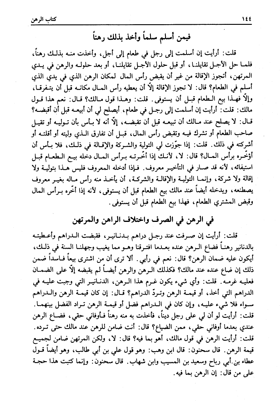 قَالَ سَحْنُونٌ: وَإِنَّمَا كَتَبْتُ هَذَا حُجَّةً عَلَى مَنْ قَالَ: إنَّ الرَّهْنَ بِمَا فِيهِ.