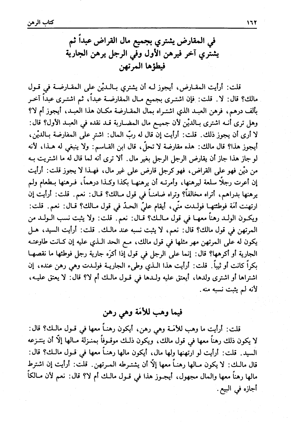 فِي الْمُقَارَضِ يَشْتَرِي بِجَمِيعِ مَالِ الْقِرَاضِ عَبْدًا ثُمَّ يَشْتَرِي آخَرَ فَيَرْهَنُ الْأَوَّلَ وَفِي الرَّجُلِ يَرْهَنُ الْجَارِيَةَ فَيَطَؤُهَا الْمُرْتَهِنُ قُلْتُ: أَرَأَيْت الْمُقَارَضَ، أَيَجُوزُ لَهُ أَنْ يَشْتَرِيَ بِالدَّيْنِ عَلَى الْمُقَارَضَةِ فِي قَوْلِ مَالِكٍ؟