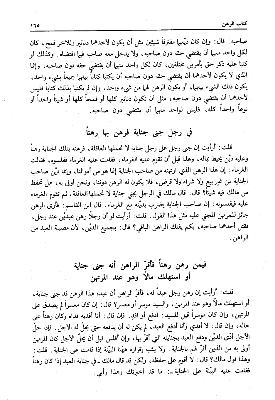 قُلْتُ: أَرَأَيْتَ إنْ جَنَى رَجُلٌ عَلَى رَجُلٍ جِنَايَةً لَا تَحْمِلُهَا الْعَاقِلَةُ، فَرَهَنَهُ بِتِلْكَ الْجِنَايَةِ رَهْنًا وَعَلَيْهِ دَيْنٌ يُحِيطُ بِمَالِهِ، وَهَذَا قَبْلَ أَنْ تَقُومَ عَلَيْهِ الْغُرَمَاءُ، فَقَامَتْ عَلَيْهِ الْغُرَمَاءُ فَفَلَّسُوهُ، فَقَالَتْ الْغُرَمَاءُ: إنَّ هَذَا الرَّهْنَ الَّذِي ارْتَهَنَهُ مِنْ صَاحِبِ الْجِنَايَةِ إنَّمَا هُوَ مِنْ أَمْوَالِنَا، وَإِنَّمَا دَيْنُ صَاحِبِ الْجِنَايَةِ مِنْ غَيْرِ بَيْعٍ وَلَا شِرَاءٍ وَلَا قَرْضٍ؛ فَلَا يَكُونُ لَهُ الرَّهْنُ دُونَنَا، وَنَحْنُ أَوْلَى بِهِ، هَلْ تَحْفَظُ مِنْ مَالِكٍ فِيهِ شَيْئًا؟
