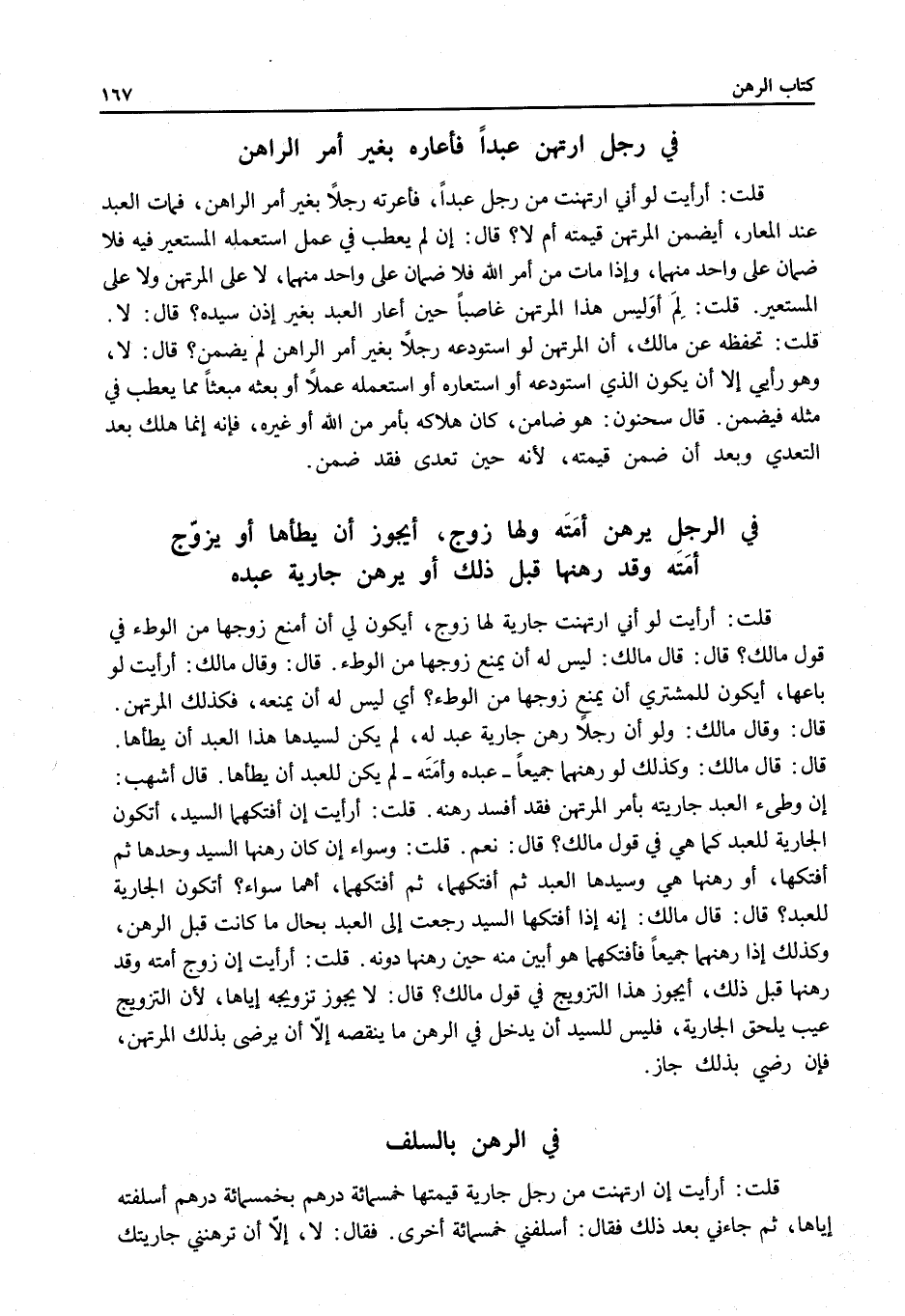 ٌ قُلْتُ: أَرَأَيْتَ لَوْ أَنِّي ارْتَهَنْت جَارِيَةً لَهَا زَوْجٌ، أَيَكُونُ لِي أَنْ أَمْنَعَ زَوْجَهَا مِنْ الْوَطْءِ فِي قَوْلِ مَالِكٍ؟