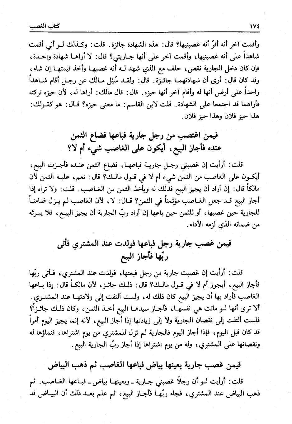 ُ قُلْتُ: أَرَأَيْتَ لَوْ أَنَّ رَجُلًا غَصَبَنِي جَارِيَةً - وَبِعَيْنِهَا بَيَاضٌ - فَبَاعَهَا الْغَاصِبُ. ثُمَّ ذَهَبَ الْبَيَاضُ عِنْدَ الْمُشْتَرِي، فَجَاءَ رَبُّهَا فَأَجَازَ الْبَيْعَ، ثُمَّ عَلِمَ بَعْدَ ذَلِكَ أَنَّ الْبَيَاضَ قَدْ