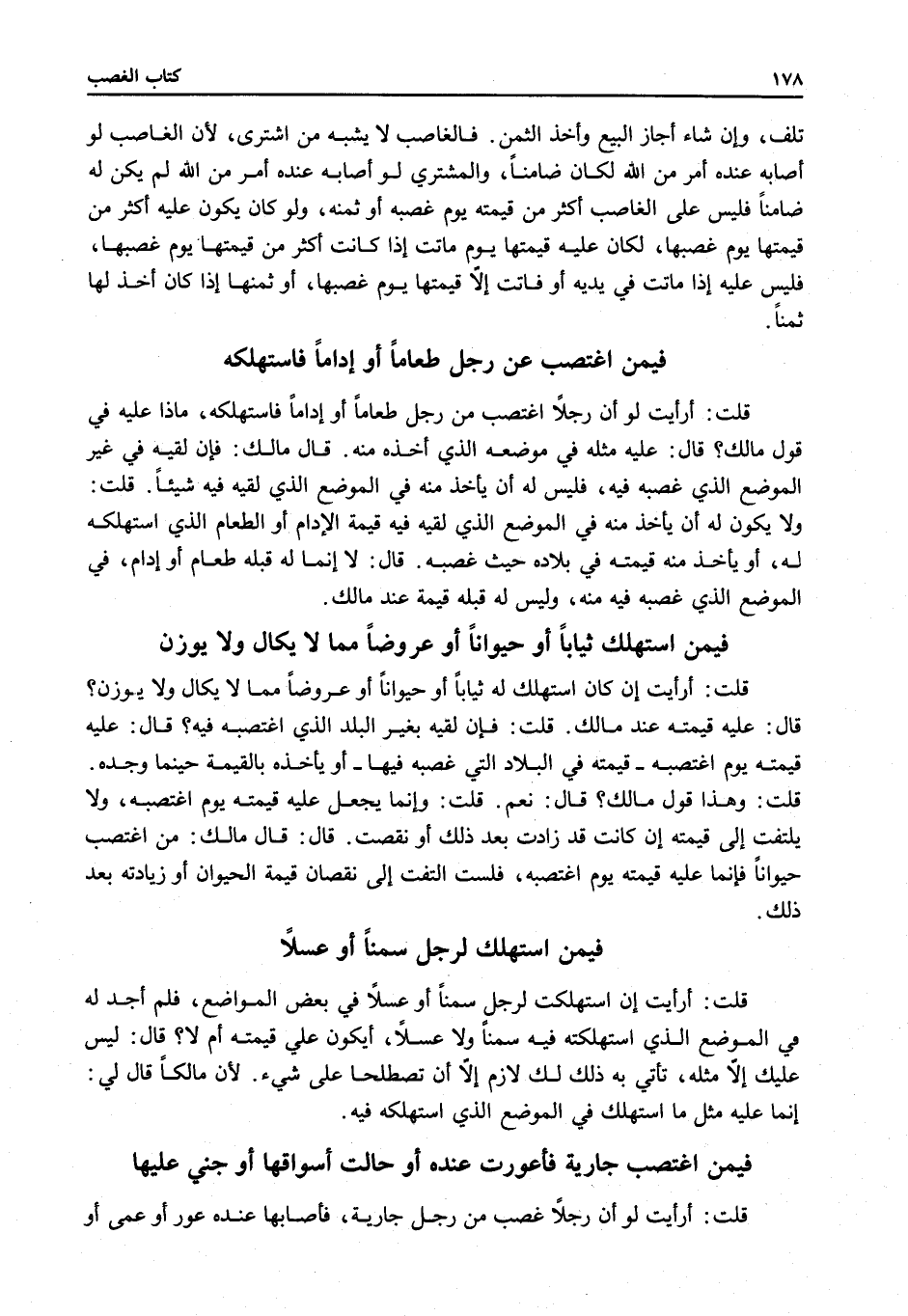 ُ قُلْتُ: أَرَأَيْتَ لَوْ أَنَّ رَجُلًا اغْتَصَبَ مِنْ رَجُلٍ طَعَامًا أَوْ إدَامًا فَاسْتَهْلَكَهُ، مَاذَا عَلَيْهِ فِي قَوْلِ مَالِكٍ؟