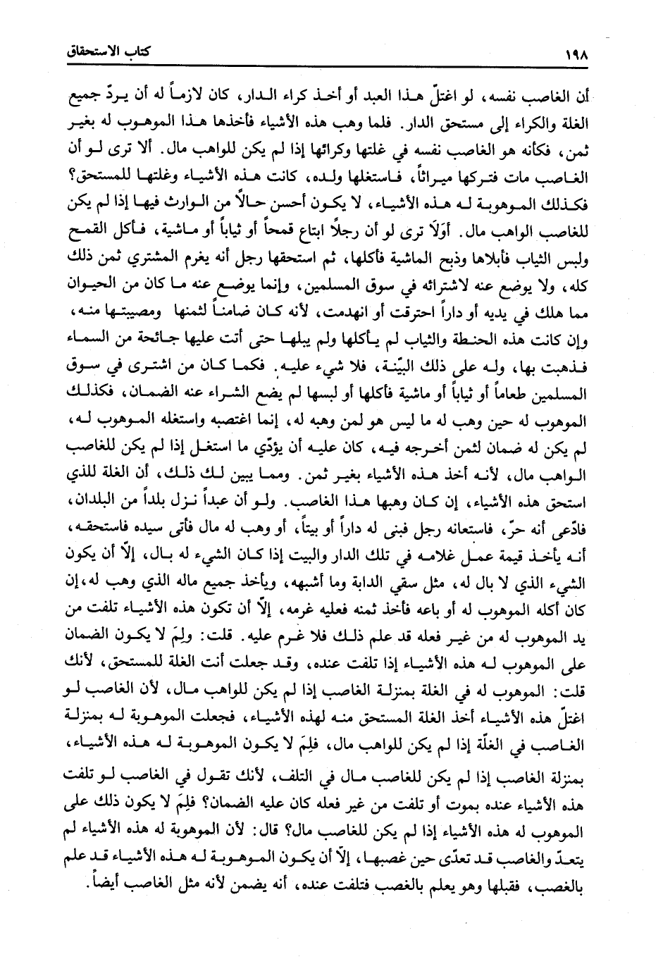 أَلَا تَرَى لَوْ أَنَّ الْغَاصِبَ مَاتَ فَتَرَكَهَا مِيرَاثًا، فَاسْتَغَلَّهَا وَلَدُهُ، كَانَتْ هَذِهِ الْأَشْيَاءُ وَغَلَّتُهَا لِلْمُسْتَحِقِّ؟ فَكَذَلِكَ الْمَوْهُوبَةُ لَهُ هَذِهِ الْأَشْيَاءُ، لَا يَكُونُ أَحْسَنُ حَالًا مِنْ الْوَارِثِ فِيهَا إذَا لَمْ يَكُنْ لِلْغَاصِبِ الْوَاهِبِ مَالٌ. أَوَلَا تَرَى لَوْ أَنَّ رَجُلًا ابْتَاعَ قَمْحًا أَوْ ثِيَابًا أَوْ مَاشِيَةً، فَأَكَلَ الْقَمْحَ وَلَبِسَ الثِّيَابَ فَأَبْلَاهَا وَذَبَحَ الْمَاشِيَةَ فَأَكَلَهَا، ثُمَّ اسْتَحَقَّهَا رَجُلٌ أَنْ يَغْرَمَ الْمُشْتَرِي ثَمَنَ ذَلِكَ كُلَّهُ، وَلَا يُوضَعُ عَنْهُ لِاشْتِرَائِهِ فِي سُوقِ الْمُسْلِمِينَ، وَإِنَّمَا يُوضَعُ عَنْهُ مَا كَانَ مِنْ الْحَيَوَانِ مِمَّا هَلَكَ فِي يَدَيْهِ أَوْ دَارًا احْتَرَقَتْ أَوْ انْهَدَمَتْ؛ لِأَنَّهُ كَانَ ضَامِنًا لِثَمَنِهَا وَمُصِيبَتِهَا مِنْهُ، وَإِنْ كَانَتْ هَذِهِ الْحِنْطَةُ وَالثِّيَابُ لَمْ يَأْكُلْهَا وَلَمْ يُبْلِهَا حَتَّى أَتَتْ عَلَيْهَا جَائِحَةٌ مِنْ السَّمَاءِ فَذَهَبَتْ بِهَا، وَلَهُ عَلَى ذَلِكَ الْبَيِّنَةُ، فَلَا شَيْءَ عَلَيْهِ. فَكَمَا كَانَ مَنْ اشْتَرَى فِي سُوقِ الْمُسْلِمِينَ طَعَامًا أَوْ ثِيَابًا أَوْ مَاشِيَةً فَأَكَلَهَا أَوْ لَبِسَهَا لَمْ يَضَعْ الشِّرَاءُ عَنْهُ الضَّمَانَ، فَكَذَلِكَ الْمَوْهُوبُ لَهُ حِينَ وُهِبَ لَهُ مَا لَيْسَ هُوَ لِمَنْ وَهَبَهُ لَهُ، إنَّمَا اغْتَصَبَهُ وَاسْتَغَلَّهُ الْمَوْهُوبُ لَهُ، لَمْ يَكُنْ لَهُ ضَمَانٌ لِثَمَنٍ أَخْرَجَهُ فِيهِ، كَانَ عَلَيْهِ أَنْ يُؤَدِّيَ مَا اسْتَغَلَّ إذَا لَمْ يَكُنْ لِلْغَاصِبِ الْوَاهِبِ مَالٌ؛ لِأَنَّهُ أَخَذَ هَذِهِ الْأَشْيَاءَ بِغَيْرِ ثَمَنٍ. وَمِمَّا يُبَيِّنُ لَكَ ذَلِكَ، أَنَّ الْغَلَّةَ لِلَّذِي اسْتَحَقَّ هَذِهِ الْأَشْيَاءَ، إنْ كَانَ وَهَبَهَا هَذَا الْغَاصِبُ.