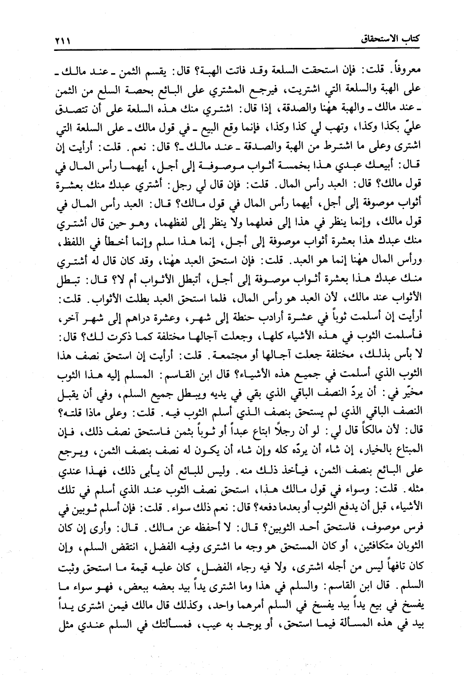 قَالَ: الْعَبْدُ رَأْسُ الْمَالِ فِي قَوْلِ مَالِكٍ، وَإِنَّمَا يُنْظَرُ فِي هَذَا إلَى فِعْلِهِمَا وَلَا يُنْظَرُ إلَى لَفْظِهِمَا، وَهُوَ حِينَ قَالَ أَشْتَرِي مِنْك عَبْدَك هَذَا بِعَشَرَةِ أَثْوَابٍ مَوْصُوفَةٍ إلَى أَجَلٍ، إنَّمَا هَذَا سَلَمٌ وَإِنَّمَا أَخْطَأَ فِي اللَّفْظِ، وَرَأْسُ الْمَالِ هَهُنَا إنَّمَا هُوَ الْعَبْدُ. قُلْت: فَإِنْ اُسْتُحِقَّ الْعَبْدُ هَهُنَا، وَقَدْ كَانَ قَالَ لَهُ أَشْتَرِي مِنْك عَبْدَك هَذَا بِعَشَرَةِ أَثْوَابٍ مَوْصُوفَةٍ إلَى أَجَلٍ، أَتَبْطُلُ الْأَثْوَابُ أَمْ لَا؟