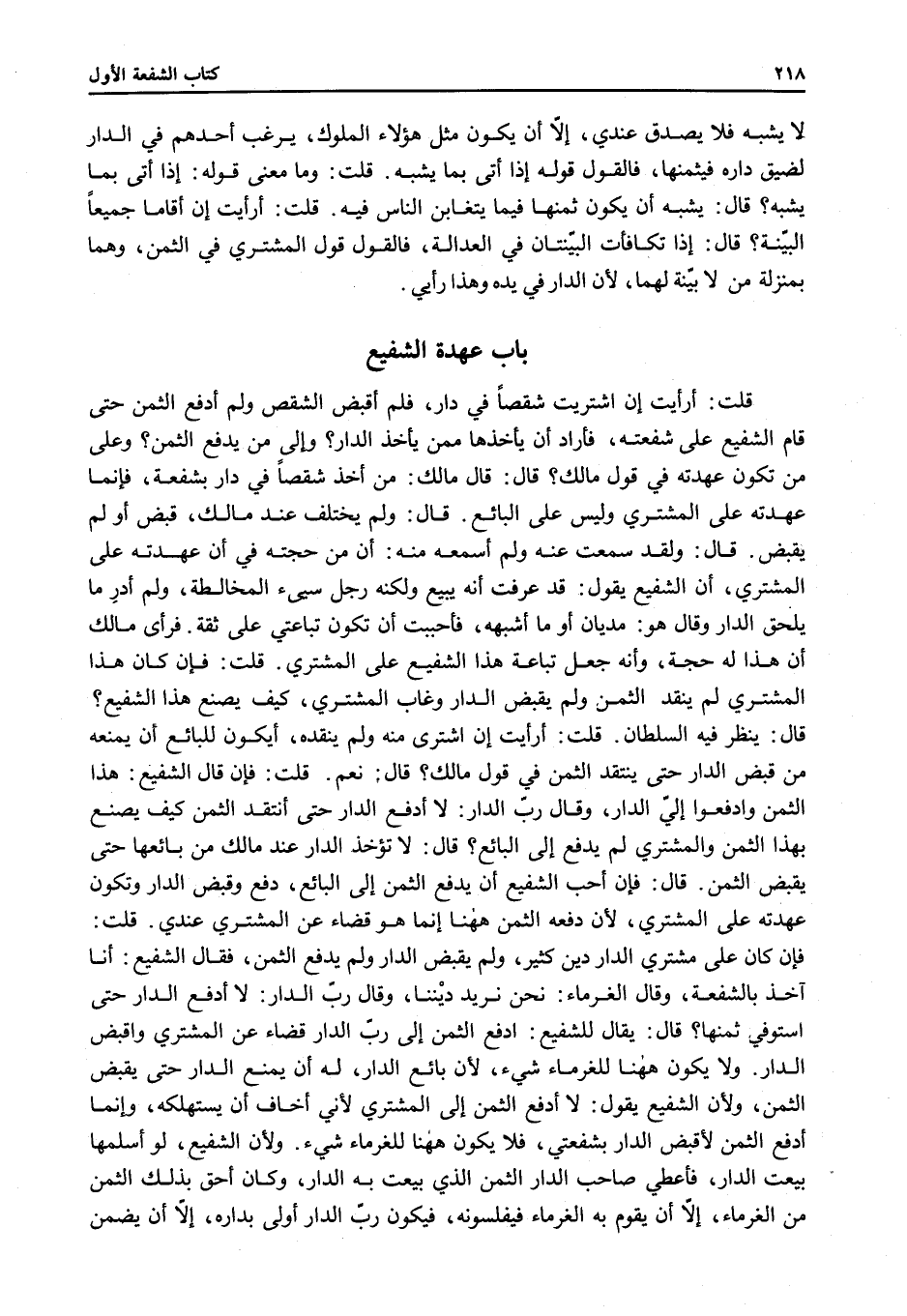 ِ قُلْت: أَرَأَيْت إنَّ اشْتَرَيْت شِقْصًا فِي دَارٍ، فَلَمْ أَقْبِضْ الشِّقْصَ وَلَمْ أَدْفَعْ الثَّمَنَ حَتَّى قَامَ الشَّفِيعُ عَلَى شُفْعَتِهِ، فَأَرَادَ أَنْ يَأْخُذَهَا مِمَّنْ يَأْخُذُ الدَّارَ؟ وَإِلَى مَنْ يَدْفَعُ الثَّمَنَ؟ وَعَلَى مَنْ تَكُونُ عُهْدَتُهُ فِي قَوْلِ مَالِكٍ؟