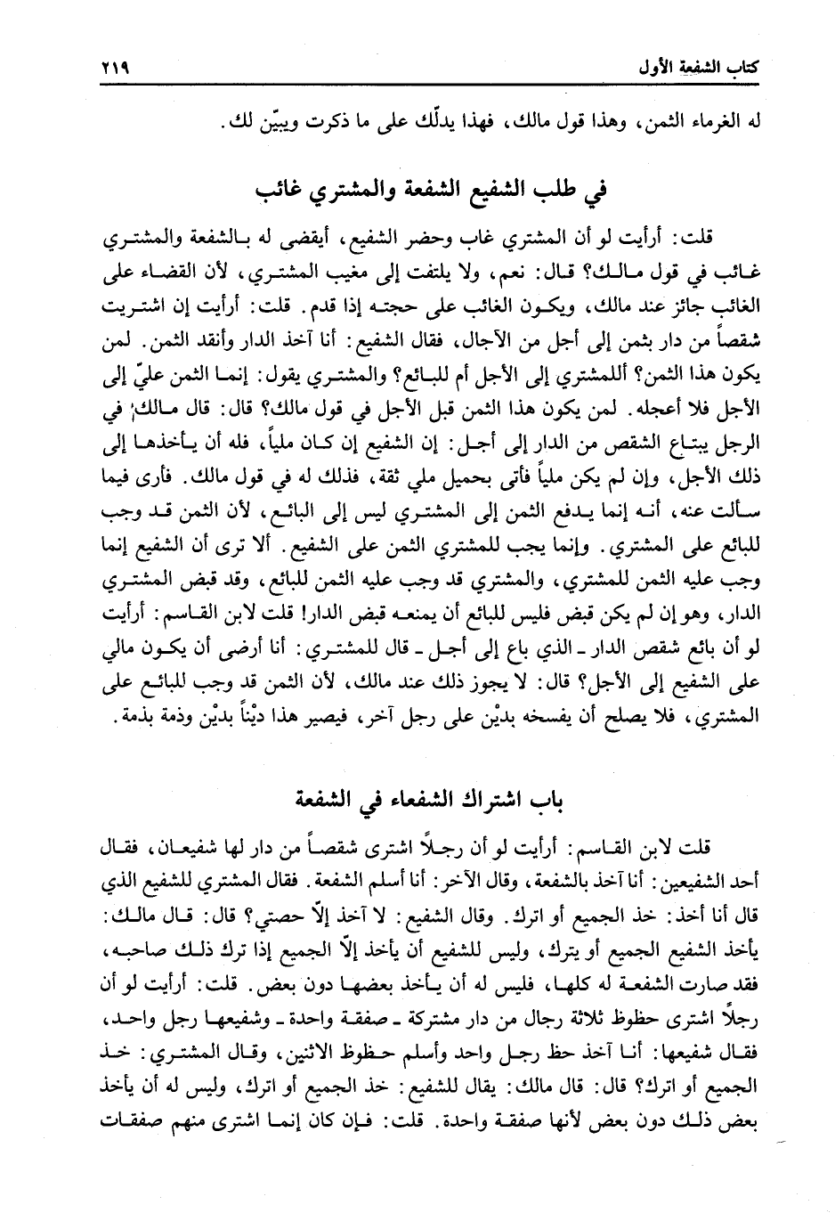 ِ قُلْت لِابْنِ الْقَاسِمِ: أَرَأَيْت لَوْ أَنَّ رَجُلًا اشْتَرَى شِقْصًا مِنْ دَارٍ لَهَا شَفِيعَانِ، فَقَالَ أَحَدُ الشَّفِيعِينَ: أَنَا آخُذُ بِالشُّفْعَةِ، وَقَالَ الْآخَرُ: أَنَا - أُسَلِّمُ الشُّفْعَةَ. فَقَالَ الْمُشْتَرِي لِلشَّفِيعِ الَّذِي قَالَ أَنَا آخُذُ: خُذْ الْجَمِيعَ أَوْ اُتْرُكْ. وَقَالَ الشَّفِيعُ: لَا آخُذُ إلَّا حِصَّتِي؟
