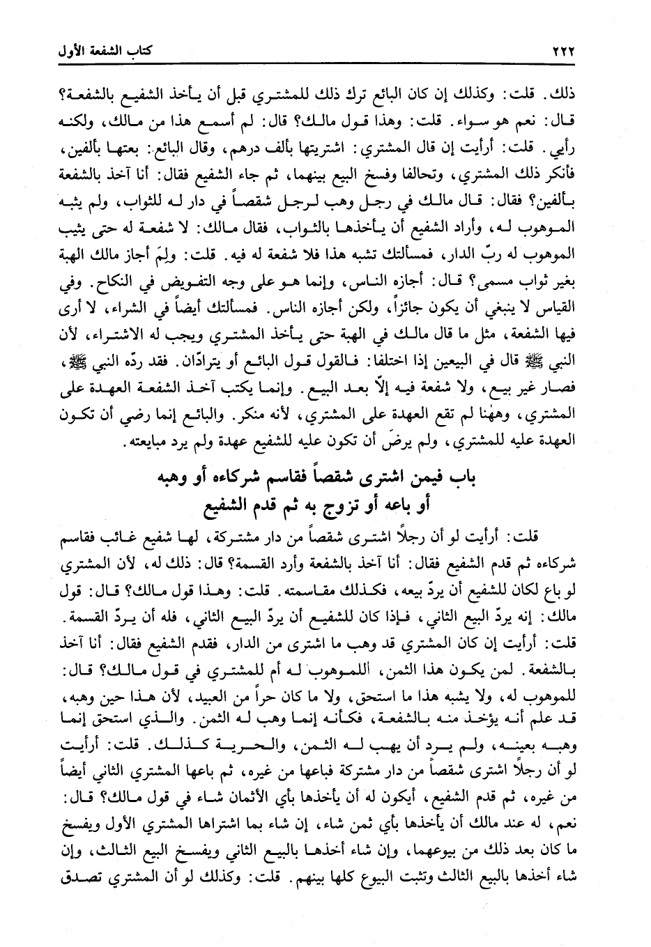 ُ قُلْت: أَرَأَيْت لَوْ أَنَّ رَجُلًا اشْتَرَى شِقْصًا مِنْ دَارٍ مُشْتَرَكَةٍ، لَهَا شَفِيعٌ غَائِبٌ فَقَاسَمَ شُرَكَاءَهُ ثُمَّ قَدِمَ الشَّفِيعُ فَقَالَ: أَنَا آخُذُ بِالشُّفْعَةِ وَأَرُدُّ الْقِسْمَةَ؟