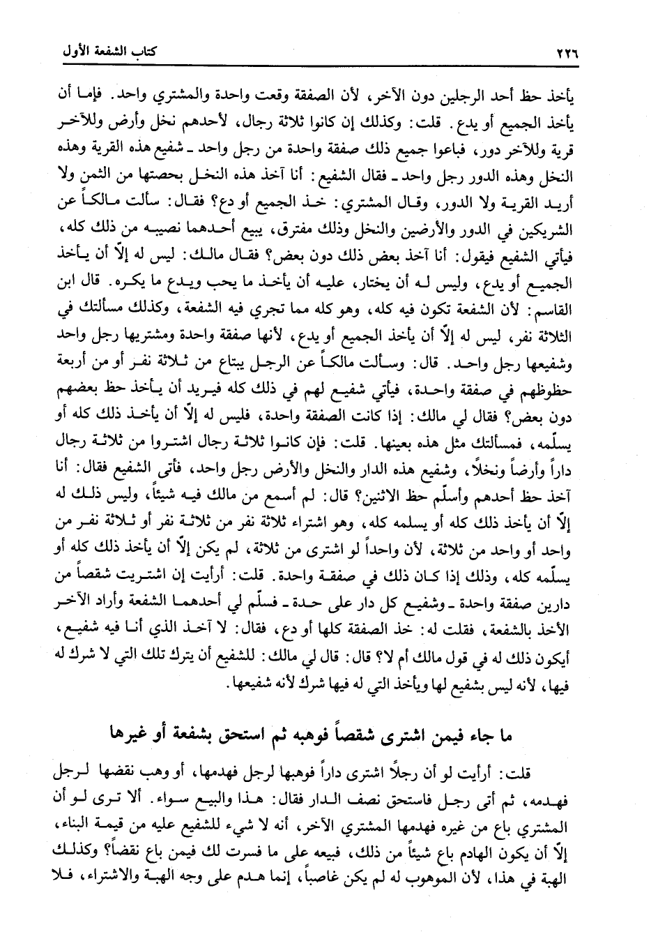 قَالَ: وَسَأَلَتْ مَالِكًا عَنْ الرَّجُلِ يَبْتَاعُ مِنْ ثَلَاثَةِ نَفَرٍ أَوْ مَنْ أَرْبَعَةٍ حُظُوظُهُمْ فِي صَفْقَةٍ وَاحِدَةٍ، فَيَأْتِي شَفِيعٌ لَهُمْ فِي ذَلِكَ كُلِّهِ فَيُرِيدُ أَنْ يَأْخُذَ حَظَّ بَعْضِهِمْ دُونَ بَعْضٍ؟ فَقَالَ لِي مَالِكٌ: إذَا كَانَتْ الصَّفْقَةُ وَاحِدَةً، فَلَيْسَ لَهُ إلَّا أَنْ يَأْخُذَ ذَلِكَ كُلَّهُ أَوْ يُسَلِّمَهُ، فَمَسْأَلَتُك مِثْلُ هَذِهِ بِعَيْنِهَا. قُلْت: فَإِنْ كَانُوا ثَلَاثَةَ رِجَالٍ اشْتَرَوْا مِنْ ثَلَاثَةِ رِجَالٍ دَارًا وَأَرْضًا وَنَخْلًا، وَشَفِيعُ هَذِهِ الدَّارِ وَالنَّخْلِ وَالْأَرْضِ رَجُلٌ وَاحِدٌ، فَأَتَى الشَّفِيعُ فَقَالَ: أَنَا آخُذُ حَظَّ أَحَدِهِمْ وَأُسَلِّمُ حَظَّ الِاثْنَيْنِ؟