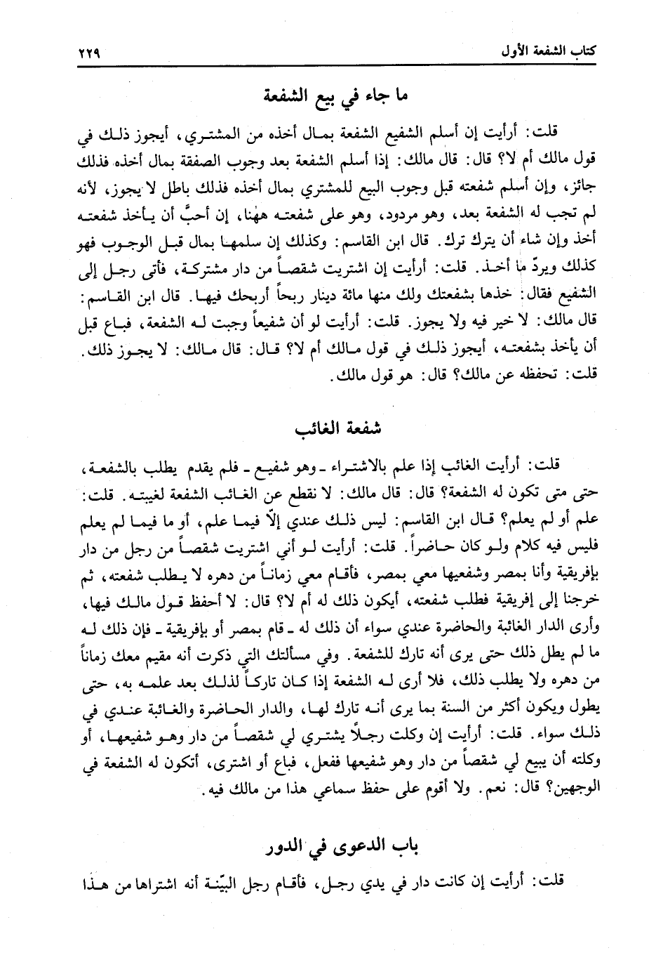 قَالَ: قَالَ مَالِكٌ: لَا نَقْطَعُ عَنْ الْغَائِبِ الشُّفْعَةَ لِغَيْبَتِهِ. قُلْت: عَلِمَ أَوْ لَمْ يَعْلَمْ؟
