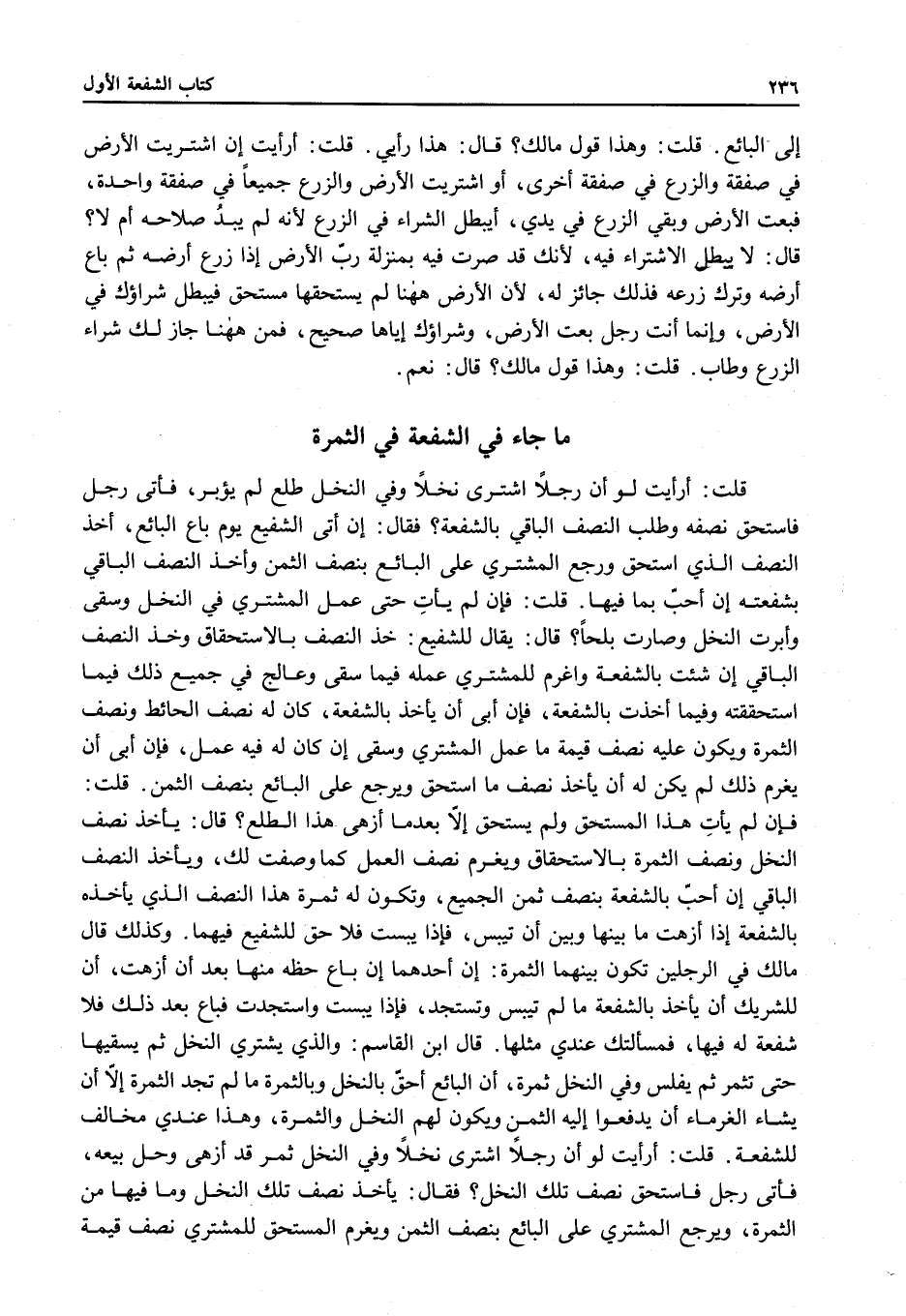 ِ قُلْت: أَرَأَيْت لَوْ أَنَّ رَجُلًا اشْتَرَى نَخْلًا وَفِي النَّخْلِ طَلْعٌ لَمْ يُؤَبَّرْ، فَأَتَى رَجُلٌ فَاسْتَحَقَّ نِصْفَهُ وَطَلَبَ النِّصْفَ الْبَاقِي بِالشُّفْعَةِ؟ فَقَالَ: إنْ أَتَى الشَّفِيعُ يَوْمَ بَاعَ الْبَائِعُ، أَخَذَ النِّصْفَ الَّذِي اسْتَحَقَّ وَرَجَعَ الْمُشْتَرِي عَلَى الْبَائِعِ بِنِصْفِ الثَّمَنِ وَأَخَذَ النِّصْفَ الْبَاقِي بِشُفْعَتِهِ إنْ أَحَبَّ بِمَا فِيهَا. قُلْت: فَإِنْ لَمْ يَأْتِ حَتَّى عَمِلَ الْمُشْتَرِي فِي النَّخْلِ وَسَقَى وَأُبِّرَتْ النَّخْلُ وَصَارَتْ بَلَحًا؟