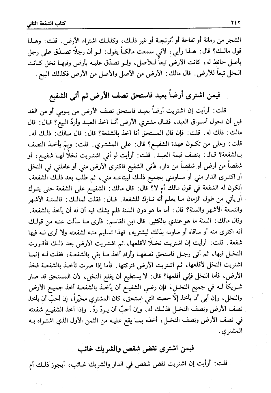 قُلْت: أَرَأَيْت لَوْ أَنَّى اشْتَرَيْت نَخْلًا لَهَا شَفِيعٌ، أَوْ شِقْصًا مِنْ أَرْضٍ أَوْ شِقْصًا مَنْ دَارٍ، فَأَتَى الشَّفِيعُ فَاكْتَرَى الْأَرْضَ مِنِّي أَوْ عَامَلَنِي فِي النَّخْلِ أَوْ اكْتَرَى الدَّارَ مِنِّي أَوْ سَاوَمَنِي بِجَمِيعِ ذَلِكَ لِيَبْتَاعَهُ مِنَى، ثُمَّ طَلَب بَعْدَ ذَلِكَ الشُّفْعَةَ، أَتَكُونُ لَهُ الشُّفْعَةُ فِي قَوْلِ مَالِكٍ أَمْ لَا؟