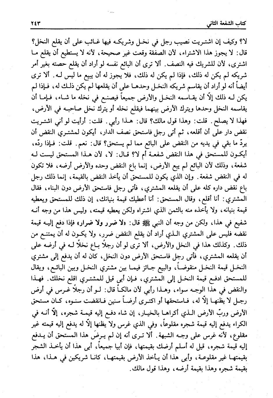 قَالَ: لَا يَجُوزُ هَذَا الِاشْتِرَاءُ؛ لِأَنَّ الصَّفْقَةَ وَقَعَتْ غَيْرَ صَحِيحَةٍ؛ لِأَنَّهُ لَا يَسْتَطِيعُ أَنْ يَقْلَعَ مَا اشْتَرَى؛ لِأَنَّ لِلشَّرِيكِ فِيهِ النِّصْفَ. أَلَا تَرَى أَنَّ الْبَائِعَ نَفْسَهُ لَوْ أَرَادَ أَنْ يَقْلَعَ حِصَّتَهُ بِغَيْرِ أَمْرِ شَرِيكِهِ لَمْ يَكُنْ لَهُ ذَلِكَ، فَإِذَا لَمْ يَكُنْ لَهُ ذَلِكَ، فَلَا يَجُوزُ لَهُ أَنْ يَبِيعَ مَا لَيْسَ لَهُ. أَلَا تَرَى أَيْضًا أَنَّهُ لَوْ أَرَادَ أَنْ يُقَاسِمَ شَرِيكَهُ النَّخْلَ وَحْدَهَا عَلَى أَنْ يَقْلَعَهَا لَمْ يَكُنْ ذَلِكَ لَهُ، فَإِذَا لَمْ يَكُنْ لَهُ ذَلِكَ إلَّا أَنْ يُقَاسِمَهُ النَّخْلَ وَالْأَرْضَ جَمِيعًا فَيَصْنَعُ فِي نَخْلِهِ مَا شَاءَ، فَإِمَّا أَنْ يُقَاسِمَهُ النَّخْلَ وَحْدَهَا وَيَتْرُكَ الْأَرْضَ بَيْنَهُمَا فَيَقْلَعَ نَخْلَهُ أَوْ يَتْرُكَ نَخْلَ صَاحِبِهِ فِي الْأَرْضِ، فَهَذَا لَا يَصْلُحُ. قُلْت: وَهَذَا قَوْلُ مَالِكٍ؟