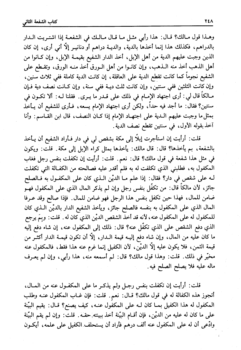 قَالَ: هَذَا رَأْيِي مِثْلَ مَا قَالَ مَالِكٌ فِي الشُّفْعَةِ إذَا اشْتَرَيْت الدَّارَ بِالدَّرَاهِمِ فَكَذَلِكَ هَذَا، إنَّمَا أَخَذَهَا بِالدِّيَةِ، وَالدِّيَةُ دِرْهَمٌ أَوْ دَنَانِيرُ إلَّا أَنِّي أَرَى إنْ كَانَ الَّذِينَ وَجَبَتْ عَلَيْهِمْ الدِّيَةُ مِنْ أَهْلِ الْإِبِلِ، أَخَذَ الدَّارَ الشَّفِيعُ بِقِيمَةِ الْإِبِلِ، وَإِنْ كَانُوا مِنْ أَهْلِ الذَّهَبِ أَخَذَ مِنْهُ الذَّهَبَ، وَأَنْ كَانُوا مِنْ أَهْلِ الْوَرِقِ أَخَذَ مِنْهُ الْوَرِقَ، وَتُقْطَعُ عَلَى الشَّفِيعِ نُجُومًا كَمَا كَانَتْ تُقْطَعُ الدِّيَةُ عَلَى الْعَاقِلَةِ، إنْ كَانَتْ الدِّيَةُ كَامِلَةً فَفِي ثَلَاثِ سِنِينَ، وَإِنْ كَانَتْ الثُّلُثَيْنِ فَفِي سَنَتَيْنِ، وَإِنْ كَانَتْ ثُلُثَ دِيَةٍ فَفِي سَنَةٍ، وَإِنْ كَانَتْ نِصْفَ دِيَةٍ فَإِنَّ مَالِكًا قَالَ لِي: أَرَى اجْتِهَادَ الْإِمَامِ فِي ذَلِكَ عَلَى قَدْرِ مَا يَرَى. فَقُلْنَا لَهُ: أَلَا تَكُونُ فِي سَنَتَيْنِ؟ فَقَالَ: مَا أَجِدُ فِيهِ حَدًّا، وَلَكِنْ أَرَى اجْتِهَادَ الْإِمَامِ يَسَعُهُ، فَأَرَى لِلشَّفِيعِ أَنْ يَأْخُذَ بِمِثْلِ مَا وَجَبَتْ عَلَيْهِمْ الدِّيَةُ عَلَى اجْتِهَادِ الْإِمَامِ إذَا كَانَ النِّصْفُ، قَالَ ابْنُ الْقَاسِمِ: وَأَنَا آخُذُ بِقَوْلِهِ الْأَوَّلِ، فِي سَنَتَيْنِ تُقْطَعُ نِصْفُ الدِّيَةِ.