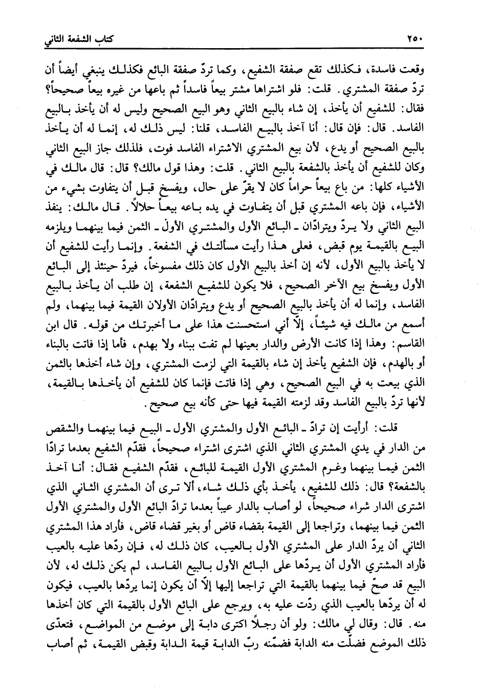 قَالَ: فَإِنْ قَالَ: أَنَا آخُذُ بِالْبَيْعِ الْفَاسِدِ، قُلْنَا: لَيْسَ ذَلِكَ لَهُ، إنَّمَا لَهُ أَنْ يَأْخُذَ بِالْبَيْعِ الصَّحِيحِ أَوْ يَدَعَ؛ لِأَنَّ بَيْعَ الْمُشْتَرِي الِاشْتِرَاءَ الْفَاسِدَ فَوْتٌ، فَلِذَلِكَ جَازَ الْبَيْعُ الثَّانِي وَكَانَ لِلشَّفِيعِ أَنْ يَأْخُذَ بِالشُّفْعَةِ بِالْبَيْعِ الثَّانِي. قُلْت: وَهَذَا قَوْلُ مَالِكٍ؟