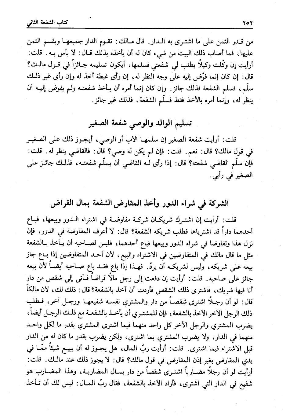 ِ قُلْت: أَرَأَيْت إنْ اشْتَرَكَ شَرِيكَانِ شَرِكَةَ مُفَاوَضَةٍ فِي اشْتِرَاءِ الدُّورِ وَبَيْعِهَا، فَبَاعَ أَحَدُهُمَا دَارًا قَدْ اشْتَرَيَاهَا فَطَلَب شَرِيكُهُ الشُّفْعَةَ؟