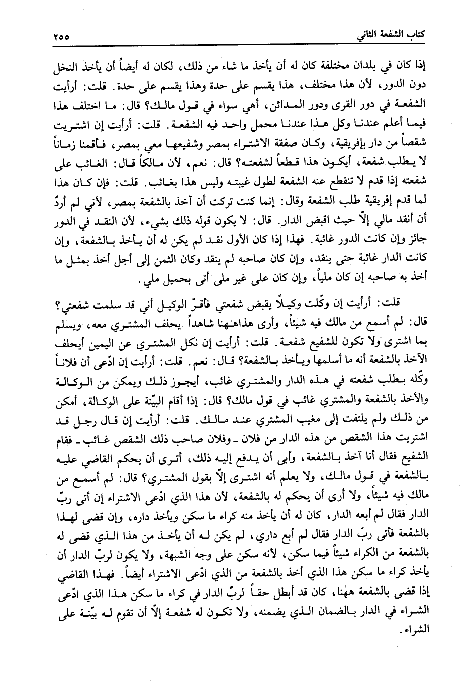 قُلْت: أَرَأَيْت إنْ اشْتَرَيْت شِقْصًا مِنْ دَارٍ بِإِفْرِيقِيَّةَ، وَكَانَ صَفْقَةُ الِاشْتِرَاءِ بِمِصْرَ وَشَفِيعُهَا مَعِي بِمِصْرَ. فَأَقَمْنَا زَمَانًا لَا يَطْلُبُ شُفْعَةً، أَيَكُونُ هَذَا قَطْعًا لِشُفْعَتِهِ؟