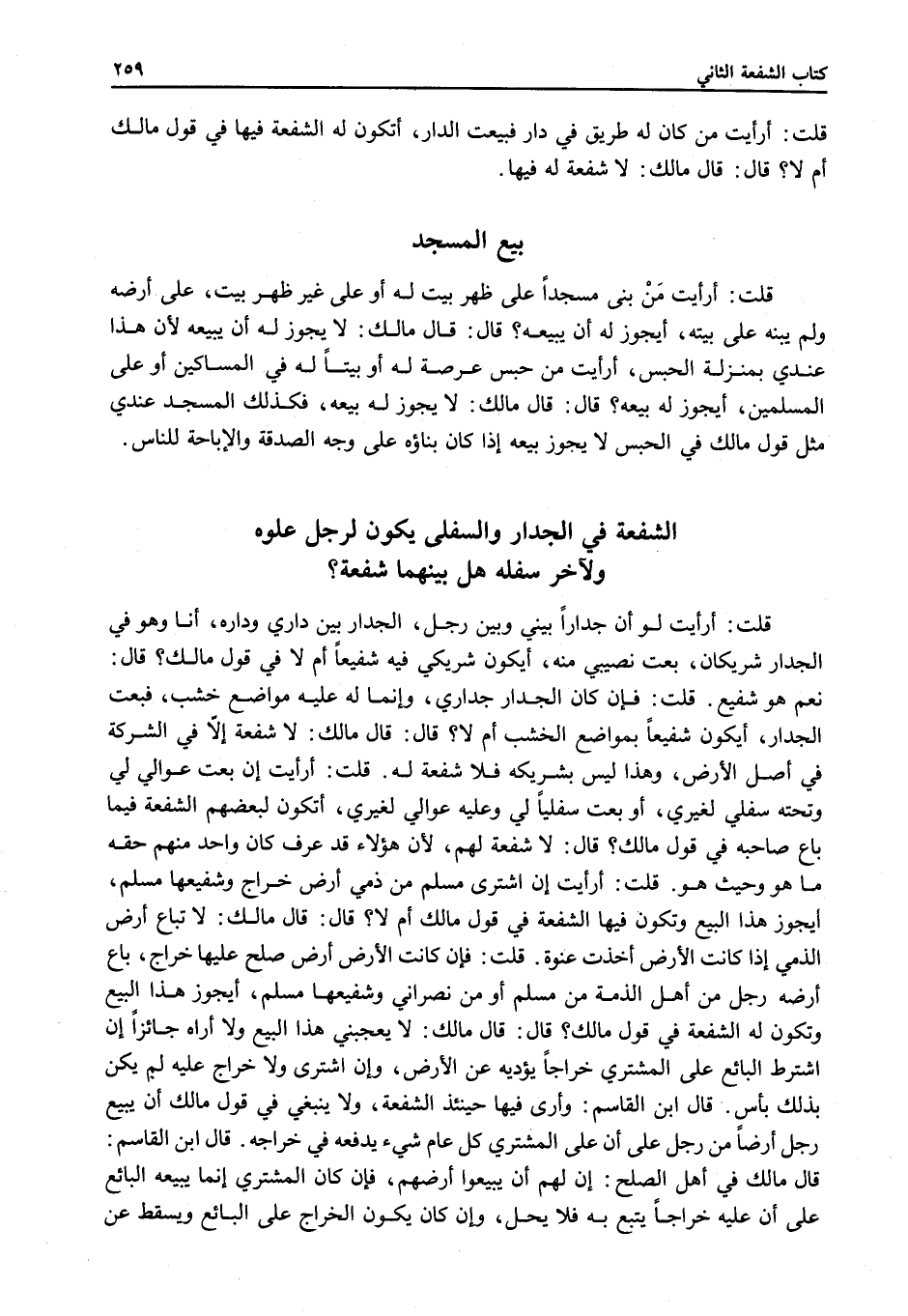 ٌ قُلْتُ: أَرَأَيْتَ لَوْ أَنَّ جِدَارًا بَيْنِي وَبَيْنَ رَجُلٍ، الْجِدَارُ بَيْنَ دَارِي وَدَارِهِ، أَنَا وَهُوَ فِي الْجِدَارِ شَرِيكَانِ، بِعْتُ نَصِيبِي مِنْهُ، أَيَكُونُ شَرِيكِي فِيهِ شَفِيعًا أَمْ لَا فِي قَوْلِ مَالِكٍ؟