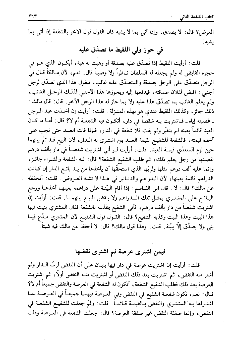قُلْتُ: أَرَأَيْتَ إنْ اشْتَرَيْت عَرْصَةً فِي دَارٍ فِيهَا بُنْيَانٌ عَلَى أَنَّ النَّقْضَ لِرَبِّ الدَّارِ وَلَمْ أَشْتَرِ مِنْهُ النَّقْضَ، ثُمَّ اشْتَرَيْت بَعْدَ ذَلِكَ النَّقْضَ أَوْ اشْتَرَيْت مِنْهُ النَّقْضَ أَوَّلًا، ثُمَّ اشْتَرَيْت الْعَرْصَةَ بَعْدَ ذَلِكَ فَطَلَبَ الشَّفِيعُ الشُّفْعَةَ، أَتَكُونُ لَهُ الشُّفْعَةُ فِي الْعَرْصَةِ وَالنَّقْضِ جَمِيعًا أَمْ لَا؟