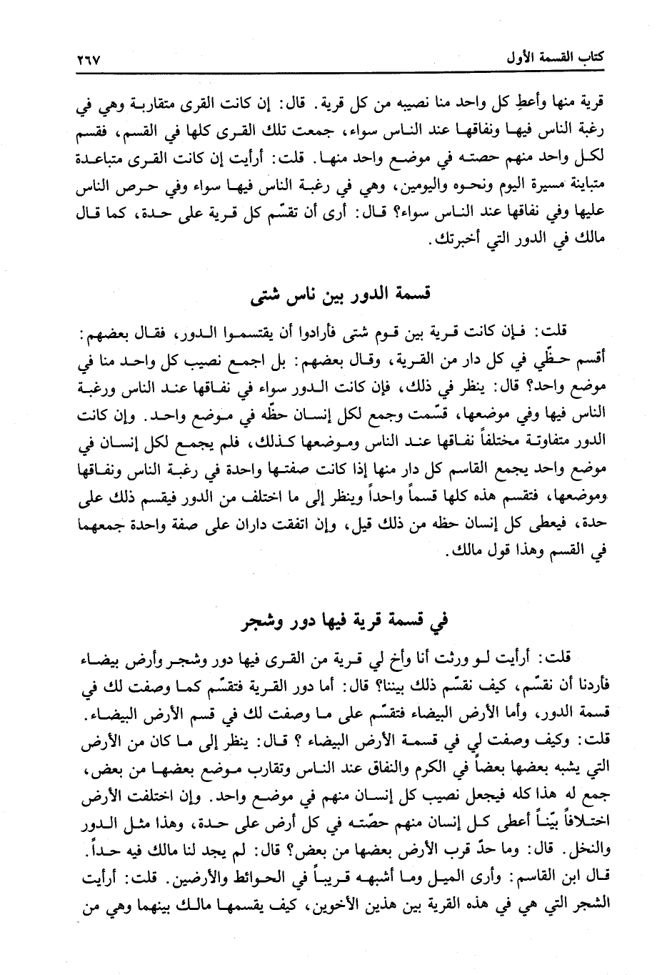 قَالَ: أَمَّا دُورُ الْقَرْيَةِ فَتُقَسَّمُ كَمَا وَصَفْتُ لَكَ فِي قِسْمَةِ الدُّورِ، وَأَمَّا الْأَرْضُ الْبَيْضَاءُ فَتُقَسَّمُ عَلَى مَا وَصَفْتُ لَكَ فِي قَسْمِ الْأَرْضِ الْبَيْضَاءِ.