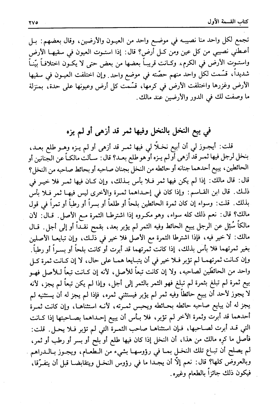 قُلْتُ: فَأَصْلُ مَا كَرِهَ مَالِكٌ مِنْ هَذَا، أَنَّ النَّخْلَ إذَا كَانَ فِيهَا طَلْعٌ أَوْ بَلَحٌ أَوْ بُسْرٌ أَوْ رُطَبٌ أَوْ تَمْرٌ، لَمْ يَصْلُحْ أَنْ تُبَاعَ تِلْكَ النَّخْلُ بِمَا فِي رُءُوسِهَا بِشَيْءٍ مِنْ الطَّعَامِ، وَيَجُوزُ بِالدَّرَاهِمِ وَبِالْعُرُوضِ كُلِّهَا؟