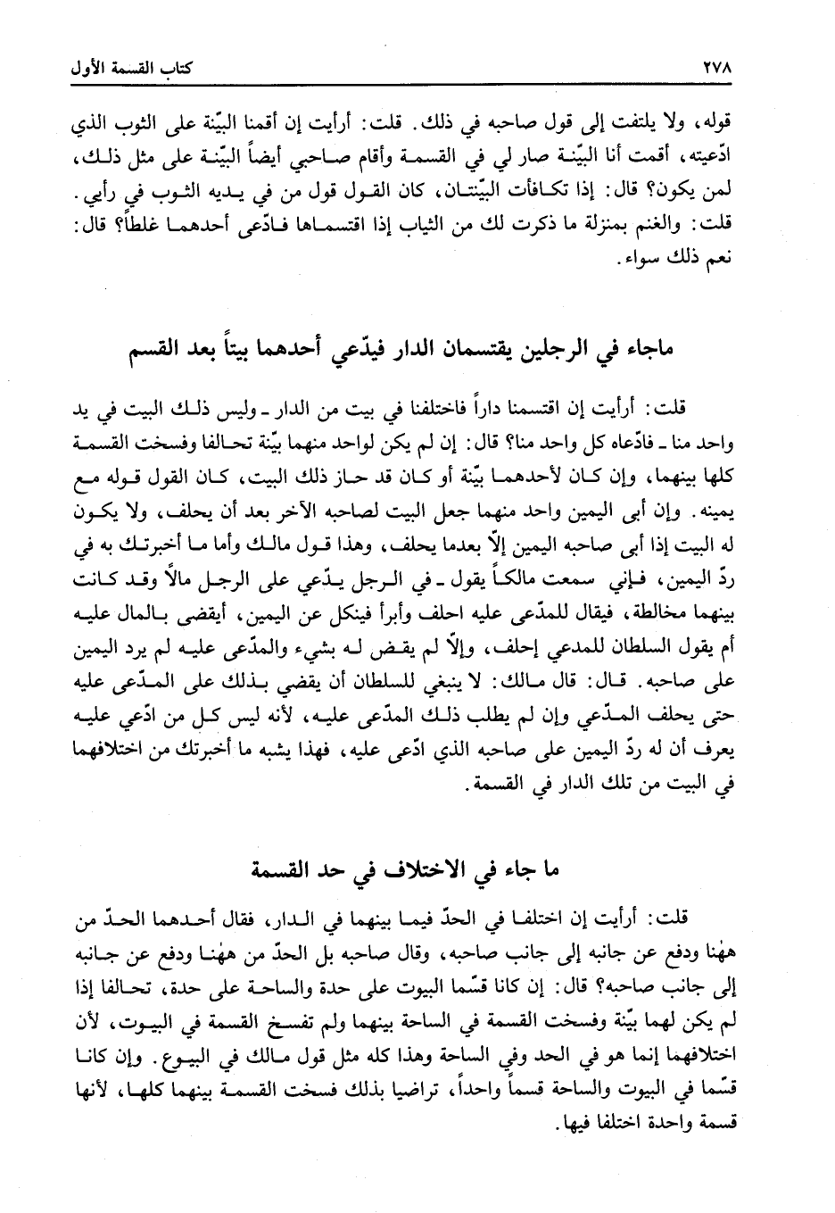 قَالَ: إنْ كَانَا قَسَمَا الْبُيُوتَ عَلَى حِدَةٍ وَالسَّاحَةَ عَلَى حِدَةٍ، تَحَالَفَا إذَا لَمْ يَكُنْ لَهُمَا بَيِّنَةٌ وَفُسِخَتْ الْقِسْمَةُ فِي السَّاحَةِ بَيْنَهُمَا وَلَمْ تُفْسَخْ الْقِسْمَةُ فِي الْبُيُوتِ؛ لِأَنَّ اخْتِلَافَهُمَا إنَّمَا هُوَ فِي الْحَدِّ وَفِي السَّاحَةِ وَهَذَا كُلُّهُ مِثْلُ قَوْلِ مَالِكٍ فِي الْبُيُوعِ. وَإِنْ كَانَا قَسَمَا فِي الْبُيُوتِ وَالسَّاحَةِ قَسْمًا وَاحِدًا، تَرَاضَيَا بِذَلِكَ فُسِخَتْ الْقِسْمَةُ بَيْنَهُمَا كُلُّهَا؛ لِأَنَّهَا قِسْمَةٌ وَاحِدَةٌ اخْتَلَفَا فِيهَا.