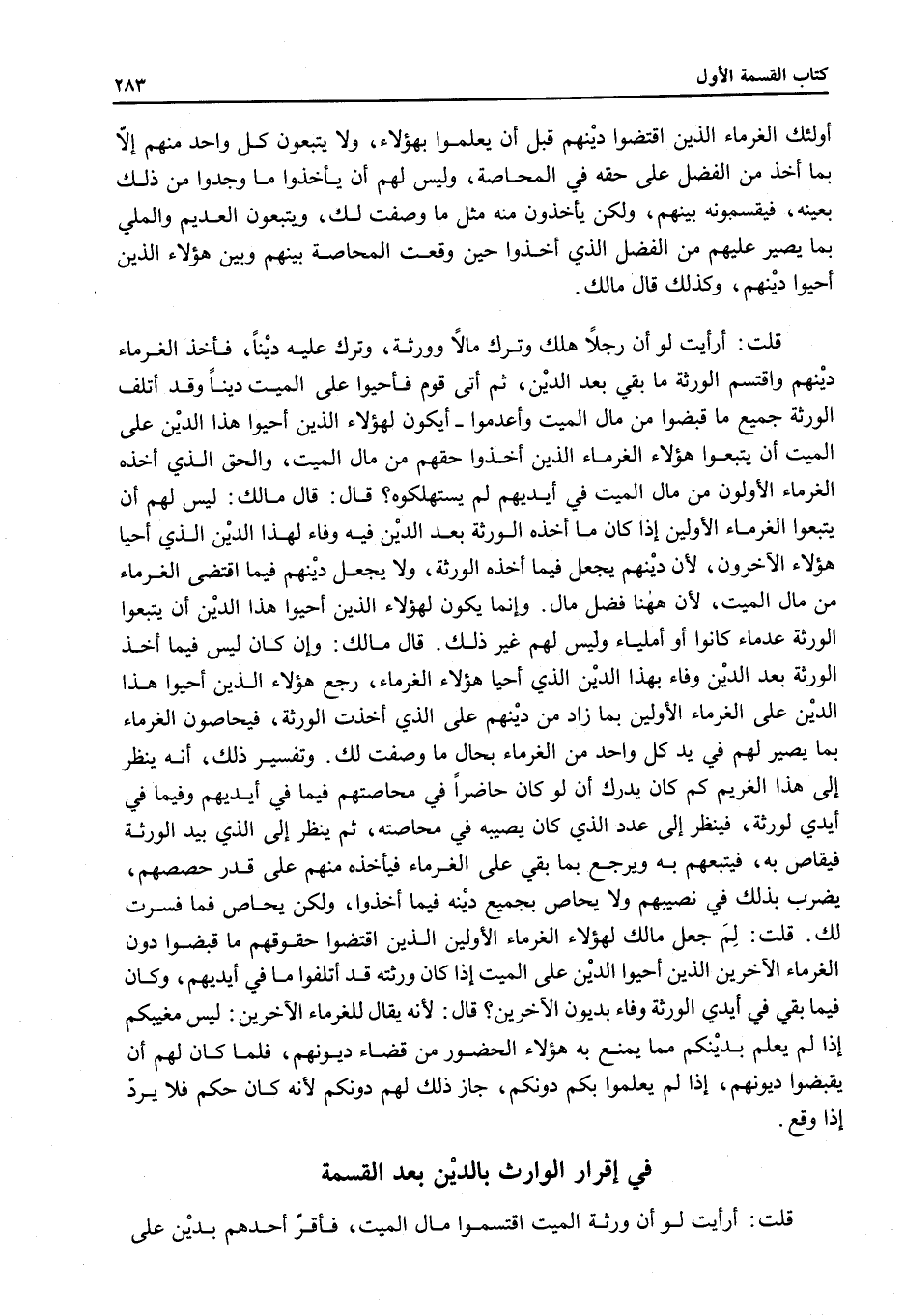 قُلْتُ: أَرَأَيْتَ لَوْ أَنَّ رَجُلًا هَلَكَ وَتَرَكَ مَالًا وَوَرَثَةً، وَتَرَكَ عَلَيْهِ دَيْنًا، فَأَخَذَ الْغُرَمَاءُ دَيْنَهُمْ وَاقْتَسَمَ الْوَرَثَةُ مَا بَقِيَ بَعْدَ الدَّيْنِ، ثُمَّ أَتَى قَوْمٌ فَأَحْيَوْا عَلَى الْمَيِّتِ دَيْنًا وَقَدْ أَتْلَفَ الْوَرَثَةُ جَمِيعَ مَا قَبَضُوا مَنْ مَالِ الْمَيِّتِ وَأُعْدِمُوا أَيَكُونُ لِهَؤُلَاءِ الَّذِينَ أَحْيَوْا هَذَا الدَّيْنَ عَلَى الْمَيِّتِ أَنْ يَتْبَعُوا هَؤُلَاءِ الْغُرَمَاءَ الَّذِينَ أَخَذُوا حَقَّهُمْ مِنْ مَالِ الْمَيِّتِ، وَالْحَقُّ الَّذِي أَخَذَهُ الْغُرَمَاءُ الْأَوَّلُونَ مِنْ مَالِ الْمَيِّتِ فِي أَيْدِيهِمْ لَمْ يَسْتَهْلِكُوهُ؟