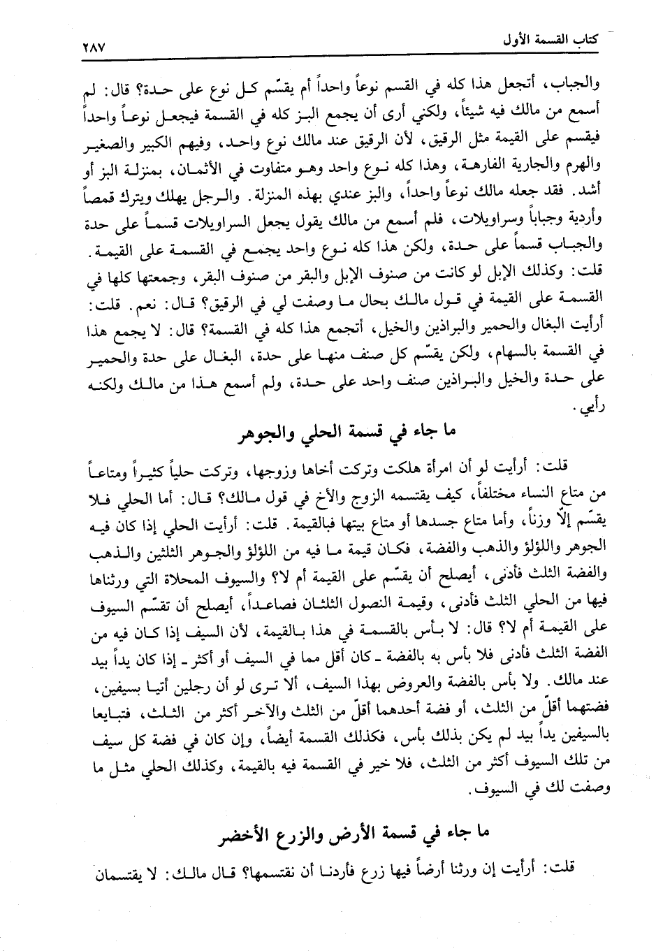 قُلْتُ: أَرَأَيْتَ الْحُلِيَّ إذَا كَانَ فِيهِ الْجَوْهَرُ وَاللُّؤْلُؤُ وَالذَّهَبُ وَالْفِضَّةُ، فَكَانَ قِيمَةُ مَا فِيهِ مَنْ اللُّؤْلُؤِ وَالْجَوْهَرِ الثُّلُثَيْنِ وَالذَّهَبِ وَالْفِضَّةِ الثُّلُثَ فَأَدْنَى، أَيَصْلُحُ أَنْ يُقَسَّمَ عَلَى الْقِيمَةِ أَمْ لَا؟ وَالسُّيُوفُ الْمُحَلَّاةٍ الَّتِي وَرِثْنَاهَا فِيهَا مِنْ الْحُلِيِّ الثُّلُثُ فَأَدْنَى، وَقِيمَةُ النُّصُولِ الثُّلُثَانِ فَصَاعِدًا، أَيَصْلُحُ أَنْ تُقَسَّمَ السُّيُوفُ عَلَى الْقِيمَةِ أَمْ لَا؟