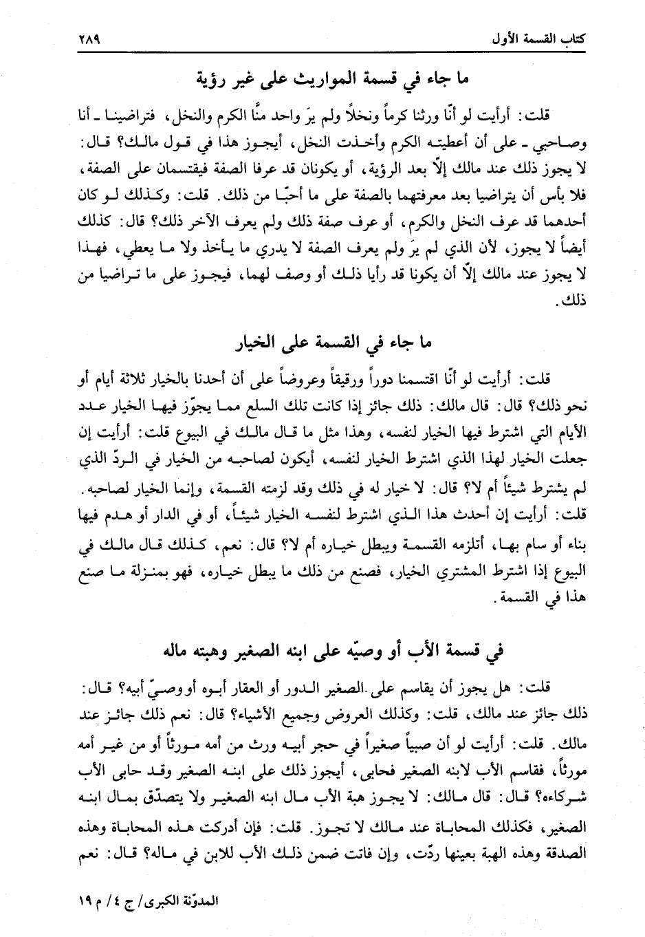 ِ قُلْتُ: أَرَأَيْتَ لَوْ أَنَّا اقْتَسَمْنَا دُورًا وَرَقِيقًا وَعُرُوضًا عَلَى أَنَّ أَحَدَنَا بِالْخِيَارِ ثَلَاثَةَ أَيَّامٍ أَوْ نَحْوَ ذَلِكَ؟