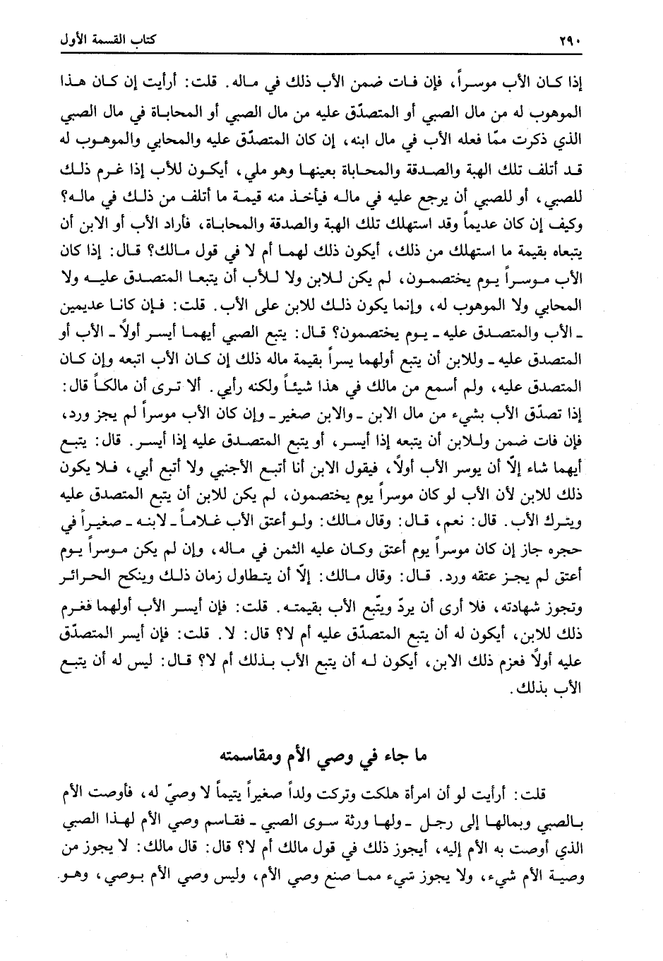ِ قُلْتُ: أَرَأَيْتَ لَوْ أَنَّ امْرَأَةً هَلَكَتْ وَتَرَكَتْ وَلَدًا صَغِيرًا يَتِيمًا لَا وَصِيَّ لَهُ، فَأَوْصَتْ الْأُمُّ بِالصَّبِيِّ وَبِمَالِهَا إلَى رَجُلٍ وَلَهَا وَرَثَةٌ سِوَى الصَّبِيِّ فَقَاسَمَ وَصِيُّ الْأُمِّ لِهَذَا الصَّبِيِّ الَّذِي أَوْصَتْ بِهِ الْأُمُّ إلَيْهِ، أَيَجُوزُ ذَلِكَ فِي قَوْلِ مَالِكٍ أَمْ لَا؟