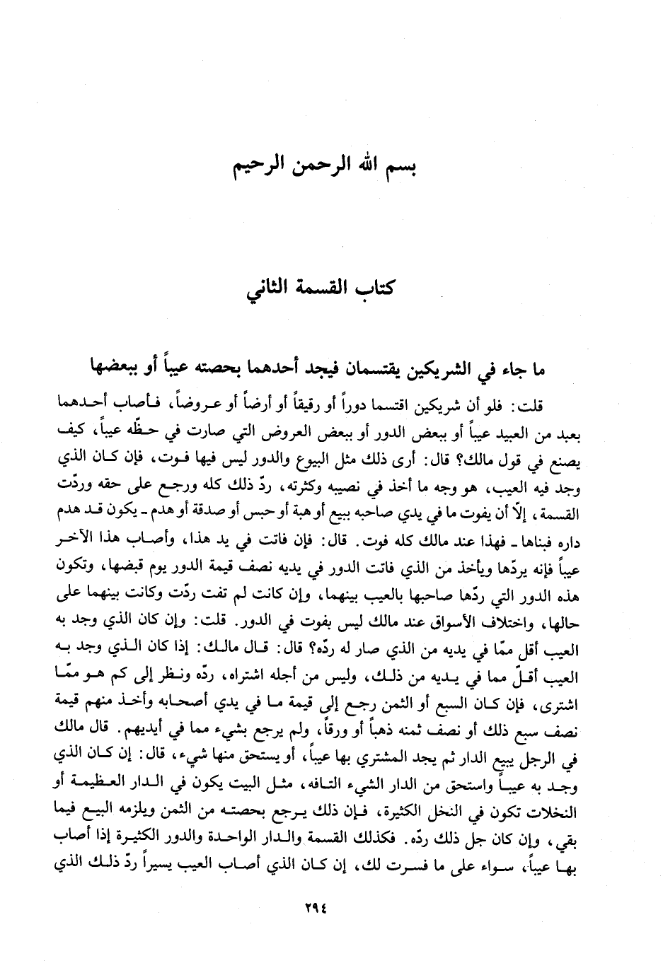 مَا جَاءَ فِي الشَّرِيكَيْنِ يَقْتَسِمَانِ فَيَجِدُ أَحَدُهُمَا بِحِصَّتِهِ عَيْبًا أَوْ بِبَعْضِهَا قُلْتُ: فَلَوْ أَنَّ شَرِيكَيْنِ اقْتَسَمَا دُورًا أَوْ رَقِيقًا أَوْ أَرْضًا أَوْ عُرُوضًا، فَأَصَابَ أَحَدُهُمَا بِعَبْدٍ مَنْ الْعَبِيدِ عَيْبًا أَوْ بِبَعْضِ الدُّورِ أَوْ بِبَعْضِ الْعُرُوضِ الَّتِي صَارَتْ فِي حَظِّهِ عَيْبًا، كَيْفَ يَصْنَعُ فِي قَوْلِ مَالِكٍ؟