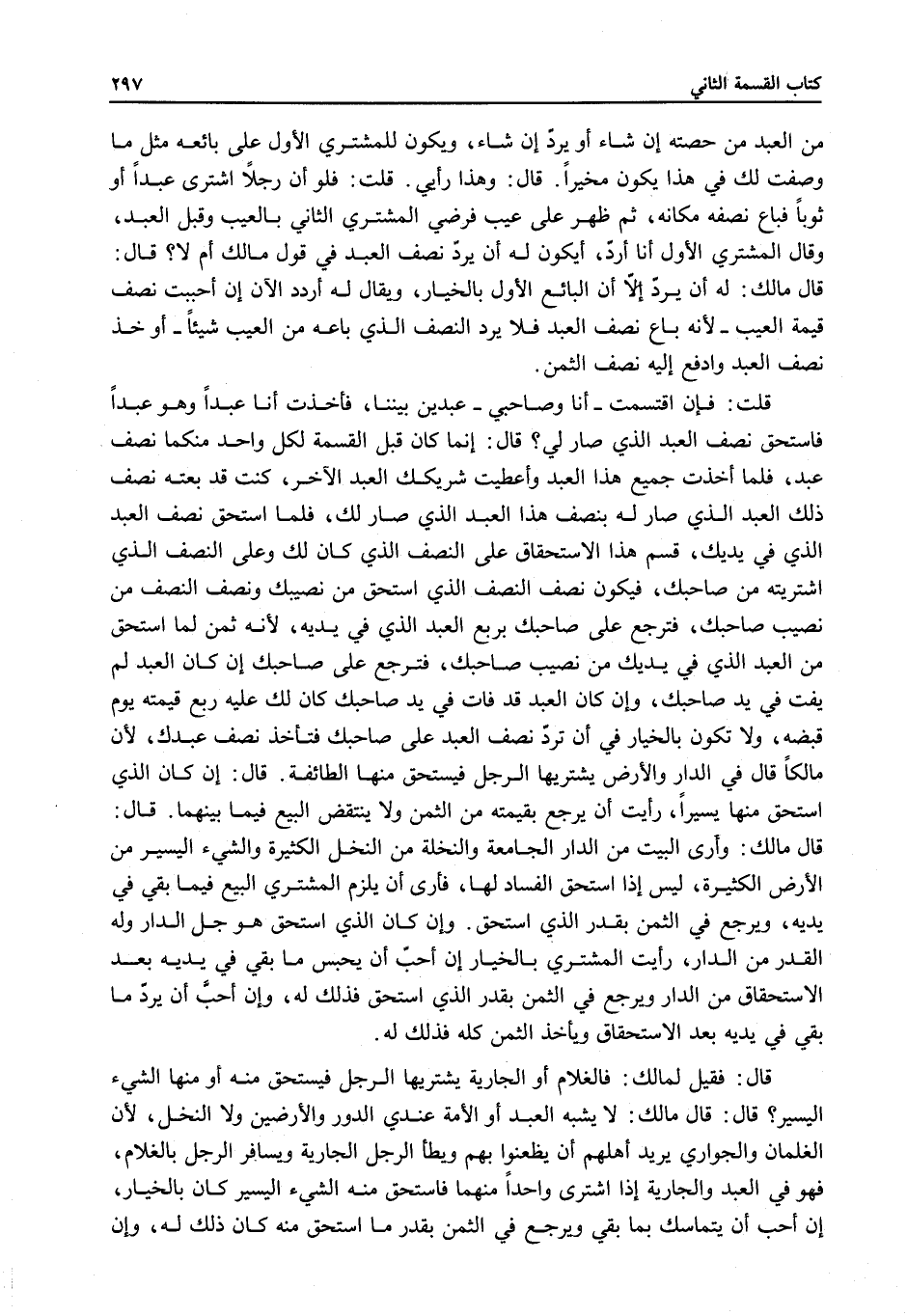قَالَ: إنَّمَا كَانَ قَبْلَ الْقِسْمَةِ لِكُلِّ وَاحِدٍ مِنْكُمَا نِصْفُ عَبْدٍ، فَلَمَّا أَخَذْتَ جَمِيعَ هَذَا الْعَبْدِ وَأَعْطَيْتَ شَرِيكَكَ الْعَبْدَ الْآخَرَ، كُنْتَ قَدْ بِعْتَهُ نِصْفَ ذَلِكَ الْعَبْدِ الَّذِي صَارَ لَهُ بِنِصْفِ هَذَا الْعَبْدِ الَّذِي صَارَ لَكَ، فَلَمَّا اُسْتُحِقَّ نِصْفُ الْعَبْدِ الَّذِي فِي يَدَيْكَ، قُسِمَ هَذَا الِاسْتِحْقَاقُ عَلَى النِّصْفِ الَّذِي كَانَ لَكَ وَعَلَى النِّصْفِ الَّذِي اشْتَرَيْتَهُ مِنْ صَاحِبِكَ، فَيَكُونُ نِصْفُ النِّصْفِ الَّذِي اُسْتُحِقَّ مِنْ نَصِيبِكَ وَنِصْفُ النِّصْفِ مِنْ نَصِيبِ صَاحِبِكَ، فَتَرْجِعُ عَلَى صَاحِبِكَ بِرُبُعِ الْعَبْدِ الَّذِي فِي يَدَيْهِ؛ لِأَنَّهُ ثَمَنٌ لِمَا اُسْتُحِقَّ مِنْ الْعَبْدِ الَّذِي فِي يَدَيْكَ مِنْ نَصِيبِ صَاحِبِكَ، فَتَرْجِعُ عَلَى صَاحِبِكَ إنْ كَانَ الْعَبْدُ لَمْ يَفُتْ فِي يَدِ صَاحِبِكَ، وَإِنْ كَانَ الْعَبْدُ قَدْ فَاتَ فِي يَدِ صَاحِبِكَ كَانَ لَكَ عَلَيْهِ رُبُعُ قِيمَتِهِ يَوْمَ قَبْضِهِ، وَلَا تَكُونُ بِالْخِيَارِ فِي أَنْ تَرُدَّ نِصْفَ الْعَبْدِ عَلَى صَاحِبِكَ فَتَأْخُذَ نِصْفَ عَبْدِكَ؛ لِأَنَّ مَالِكًا قَالَ فِي الدَّارِ وَالْأَرْضِ يَشْتَرِيهَا الرَّجُلُ فَيُسْتَحَقُّ مِنْهَا الطَّائِفَةُ.