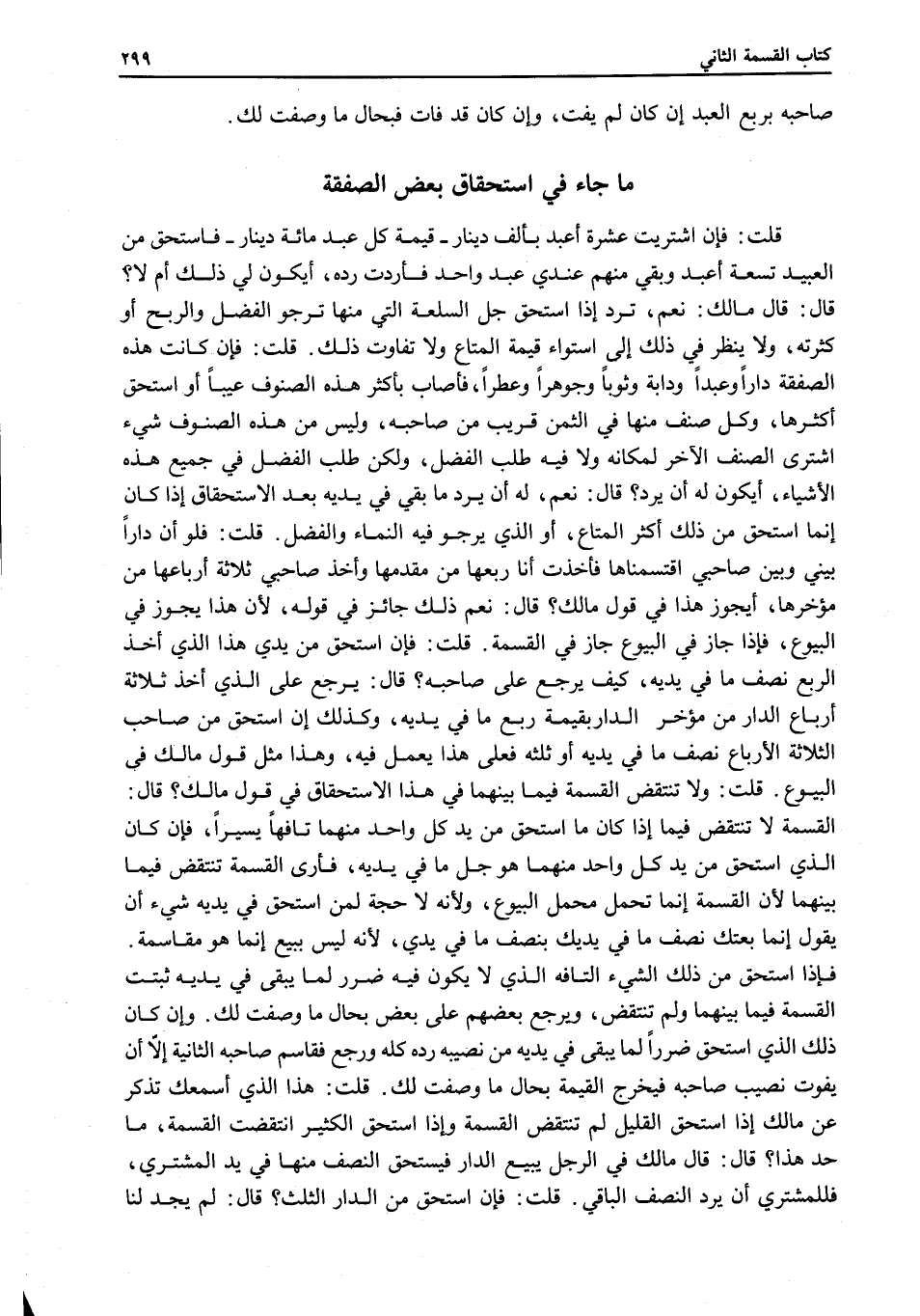 قَالَ: يَرْجِعُ عَلَى الَّذِي أَخَذَ ثَلَاثَةَ أَرْبَاعِ الدَّارِ مِنْ مُؤَخَّرِ الدَّارِ بِقِيمَةِ رُبُعِ مَا فِي يَدَيْهِ، وَكَذَلِكَ إنْ اُسْتُحِقَّ مِنْ صَاحِبِ الثَّلَاثَةِ الْأَرْبَاعِ نِصْفُ مَا فِي يَدَيْهِ أَوْ ثُلُثُهُ فَعَلَى هَذَا يُعْمَلُ فِيهِ، وَهَذَا مِثْلُ قَوْلِ مَالِكٍ فِي الْبُيُوعِ.