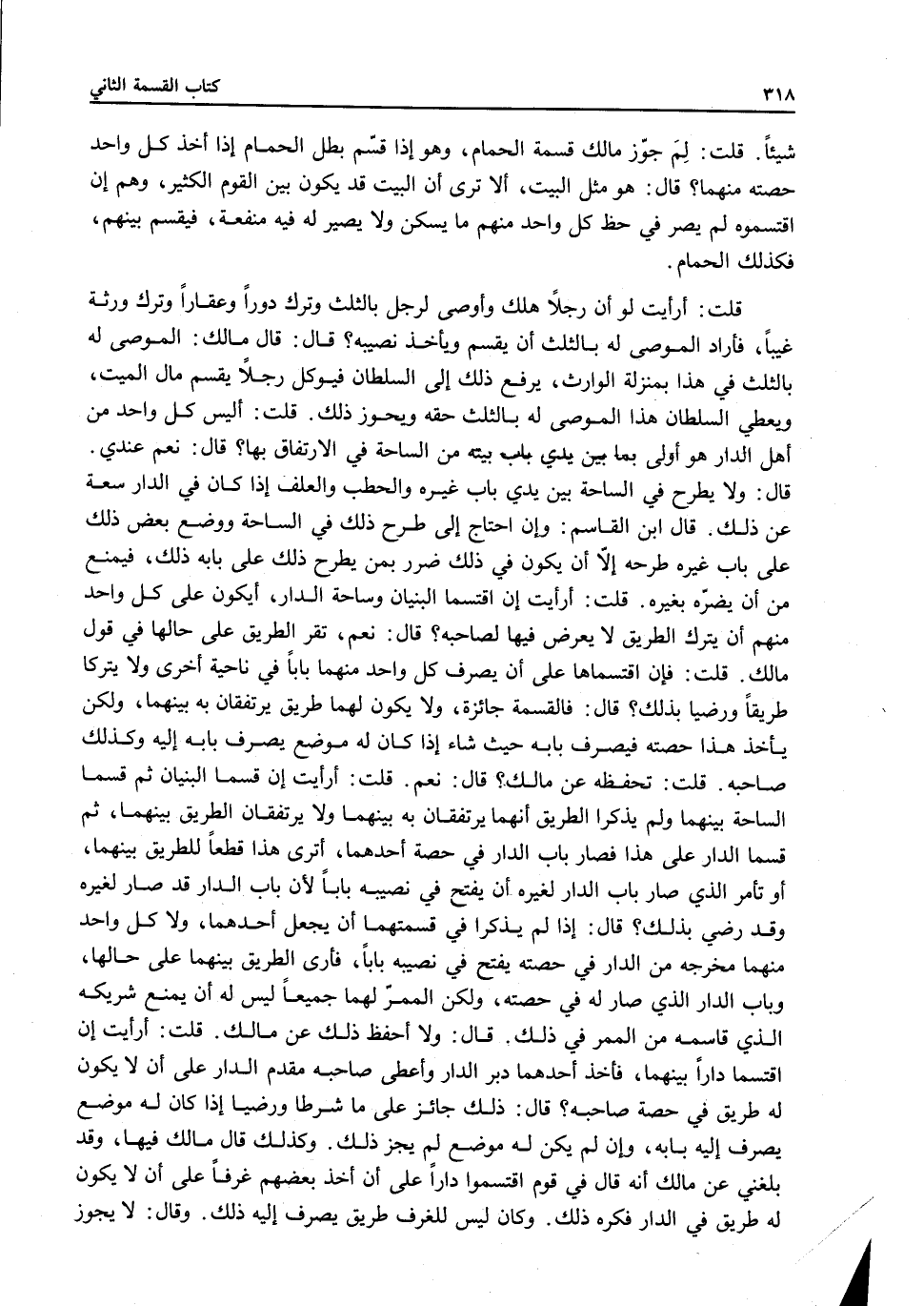 قُلْتُ: أَرَأَيْتَ إنْ اقْتَسَمَا الْبُنْيَانَ وَسَاحَةَ الدَّارِ، أَيَكُونُ عَلَى كُلِّ وَاحِدٍ مِنْهُمْ أَنْ يَتْرُكَ الطَّرِيقَ لَا يَعْرِضُ فِيهَا لِصَاحِبِهِ؟