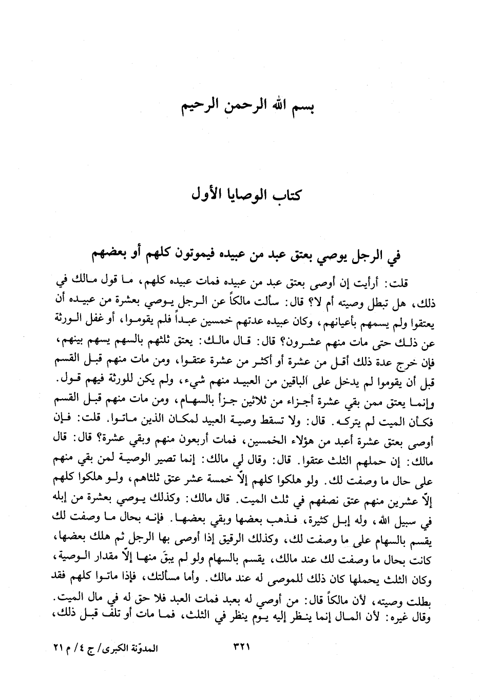 ُ فِي الرَّجُلِ يُوصِي بِعِتْقِ عَبْدٍ مِنْ عَبِيدِهِ فَيَمُوتُونَ كُلُّهُمْ أَوْ بَعْضُهُمْ قُلْتُ: أَرَأَيْتَ إنْ أَوْصَى بِعِتْقِ عَبْدٍ مِنْ عَبِيدِهِ فَمَاتَ عَبِيدُهُ كُلُّهُمْ، مَا قَوْلُ مَالِكٍ فِي ذَلِكَ، هَلْ تَبْطُلُ وَصِيَّتُهُ أَمْ لَا؟