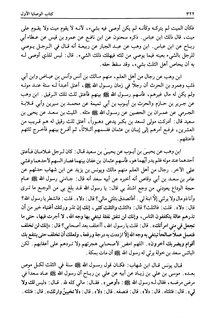 ابْنُ وَهْبٍ عَنْ يَحْيَى بْنِ أَيُّوبَ عَنْ يَحْيَى بْنِ سَعِيدٍ قَالَ: كَانَ لِرَجُلٍ غُلَامَانِ فَأَعْتَقَ أَحَدَهُمَا عِنْدَ مَوْتِهِ فَلَمْ يُدْرَ أَيُّهُمَا هُوَ، فَأَسْهَمَ عُثْمَانُ بْنُ عَفَّانَ بَيْنَهُمَا فَصَارَ السَّهْمُ لِأَحَدِهِمَا وَغُشِيَ عَلَى الْآخَرِ. رِجَالٌ مِنْ أَهْلِ الْعِلْمِ مِنْهُمْ مَالِكٌ وَيُونُسُ بْنُ يَزِيدَ عَنْ ابْنِ شِهَابٍ حَدَّثَهُمْ عَنْ عَامِرِ بْنِ سَعْدِ بْنِ أَبِي وَقَّاصٍ أَنَّهُ أَخْبَرَهُ عَنْ أَبِيهِ سَعْدٍ أَنَّهُ قَالَ: «جَاءَنِي رَسُولُ اللَّهِ - صَلَّى اللَّهُ عَلَيْهِ وَسَلَّمَ - عَامَ حَجَّةِ الْوَدَاعِ يَعُودُنِي مِنْ وَجَعٍ اشْتَدَّ بِي قَالَ: يَا رَسُولَ اللَّهِ قَدْ بَلَغَ بِي مِنْ الْوَجَعِ مَا تَرَى وَأَنَا ذُو مَالٍ وَلَا يَرِثُنِي إلَّا ابْنَةٌ لِي. أَفَأَتَصَدَّقُ بِثُلُثَيْ مَالِي؟ قَالَ: لَا. قُلْتُ: فَالشَّطْرُ يَا رَسُولَ اللَّهِ؟ قَالَ: لَا. قُلْتُ: فَالثُّلُثُ؟ قَالَ: الثُّلُثُ وَالثُّلُثُ كَثِيرٌ، إنَّكَ إنْ تَذَرْ وَرَثَتَكَ أَغْنِيَاءَ خَيْرٌ مِنْ أَنْ تَذَرَهُمْ عَالَةً يَتَكَفَّفُونَ النَّاسَ، وَإِنَّكَ لَنْ تُنْفِقَ نَفَقَةً تَبْتَغِي بِهَا وَجْهَ اللَّهِ، إلَّا أُجِرْتَ فِيهَا، حَتَّى مَا تَجْعَلُ فِي فِي امْرَأَتِكَ. قَالَ: قُلْتُ يَا رَسُولَ اللَّهِ، أَأُخَلَّفُ بَعْدَ أَصْحَابِي؟ قَالَ: إنَّكَ لَنْ تُخَلَّفَ فَتَعْمَلَ عَمَلًا صَالِحًا تَبْتَغِي بِهِ وَجْهَ اللَّهِ إلَّا ازْدَدْتَ بِهِ دَرَجَةً وَرِفْعَةً، وَلَعَلَّكَ أَنْ تُخَلَّفَ حَتَّى يَنْتَفِعَ بِكَ أَقْوَامٌ وَيُضَرُّ بِكَ آخَرُونَ. اللَّهُمَّ أَمْضِ لِأَصْحَابِي هِجْرَتَهُمْ وَلَا تَرُدَّهُمْ عَلَى أَعْقَابِهِمْ. لَكِنْ الْبَائِسُ سَعْدُ بْنُ خَوْلَةَ يَرْثِي لَهُ رَسُولُ اللَّهِ - صَلَّى اللَّهُ عَلَيْهِ وَسَلَّمَ - أَنْ مَاتَ بِمَكَّةَ» .
