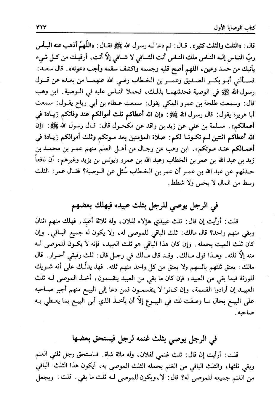 قَالَ سَعْدٌ: فَسَأَلَنِي أَبُو بَكْرٍ الصِّدِّيقُ وَعُمَرُ بْنُ الْخَطَّابِ - رَضِيَ اللَّهُ عَنْهُ - مِنْ بَعْدِهِ عَنْ قَوْلِ رَسُولِ اللَّهِ - صَلَّى اللَّهُ عَلَيْهِ وَسَلَّمَ - فِي الْوَصِيَّةِ فَحَدَّثْتُهُمَا بِذَلِكَ، فَحَمَلَا النَّاسَ عَلَيْهِ فِي الْوَصِيَّةِ. ابْنُ وَهْبٍ قَالَ: وَسَمِعْتُ طَلْحَةَ بْنَ عَمْرٍو الْمَكِّيَّ يَقُولُ: سَمِعْتُ عَطَاءَ بْنَ أَبِي رَبَاحٍ يَقُولُ: سَمِعْتُ أَبَا هُرَيْرَةَ يَقُولُ: قَالَ رَسُولُ اللَّهِ - صَلَّى اللَّهُ عَلَيْهِ وَسَلَّمَ -: «إنَّ اللَّهَ أَعْطَاكُمْ ثُلُثَ أَمْوَالِكُمْ عِنْدَ وَفَاتِكُمْ زِيَادَةً فِي أَعْمَالِكُمْ» . مَسْلَمَةُ بْنُ عَلِيٍّ عَنْ زَيْدِ بْنِ وَاقِدٍ عَنْ مَكْحُولٍ قَالَ: قَالَ رَسُولُ اللَّهِ - صَلَّى اللَّهُ عَلَيْهِ وَسَلَّمَ -: «إنَّ اللَّهَ أَعْطَاكُمْ اثْنَتَيْنِ لَمْ تَكُونَا لَكُمْ: صَلَاةَ الْمُؤْمِنِينَ بَعْدَ مَوْتِكُمْ وَثُلُثَ أَمْوَالِكُمْ زِيَادَةً فِي أَعْمَالِكُمْ عِنْدَ مَوْتِكُمْ» . ابْنُ وَهْبٍ عَنْ رِجَالٍ مِنْ أَهْلِ الْعِلْمِ مِنْهُمْ عُمَرُ بْنُ مُحَمَّدِ بْنِ زَيْدِ بْنِ عَبْدِ اللَّهِ بْنِ عُمَرَ بْنِ الْخَطَّابِ وَعَبْدُ اللَّهِ بْنُ عَمْرٍو وَيُونُسُ بْنُ يَزِيدَ وَغَيْرُهُمْ، أَنَّ نَافِعًا حَدَّثَهُمْ عَنْ عَبْدِ اللَّهِ بْنِ عُمَرَ أَنَّ عُمَرَ بْنَ الْخَطَّابِ سُئِلَ عَنْ الْوَصِيَّةِ؟ فَقَالَ عُمَرُ: الثُّلُثُ وَسَطٌ مِنْ الْمَالِ لَا بَخْسٌ وَلَا شَطَطٌ.