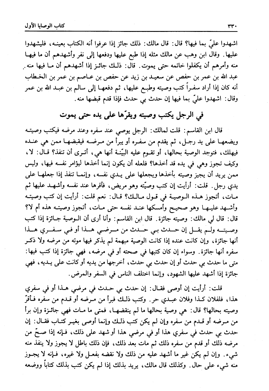 َ قَالَ ابْنُ الْقَاسِمِ قُلْتُ لِمَالِكٍ: الرَّجُلُ يُوصِي عِنْدَ سَفَرِهِ وَعِنْدَ مَرَضِهِ فَيَكْتُبُ وَصِيَّتَهُ وَيَضَعُهَا عَلَى يَدِ رَجُلٍ، ثُمَّ يَقْدَمُ مِنْ سَفَرِهِ أَوْ يَبْرَأُ مَنْ مَرَضِهِ فَيَقْبِضُهَا مِمَّنْ هِيَ عِنْدَهُ فَيَهْلِكُ، فَتُوجَدُ الْوَصِيَّةُ بِحَالِهَا، أَوْ تَقُومُ عَلَيْهِ الْبَيِّنَةُ أَنَّهَا هِيَ، أَتَرَى أَنْ تَنْفُذَ؟