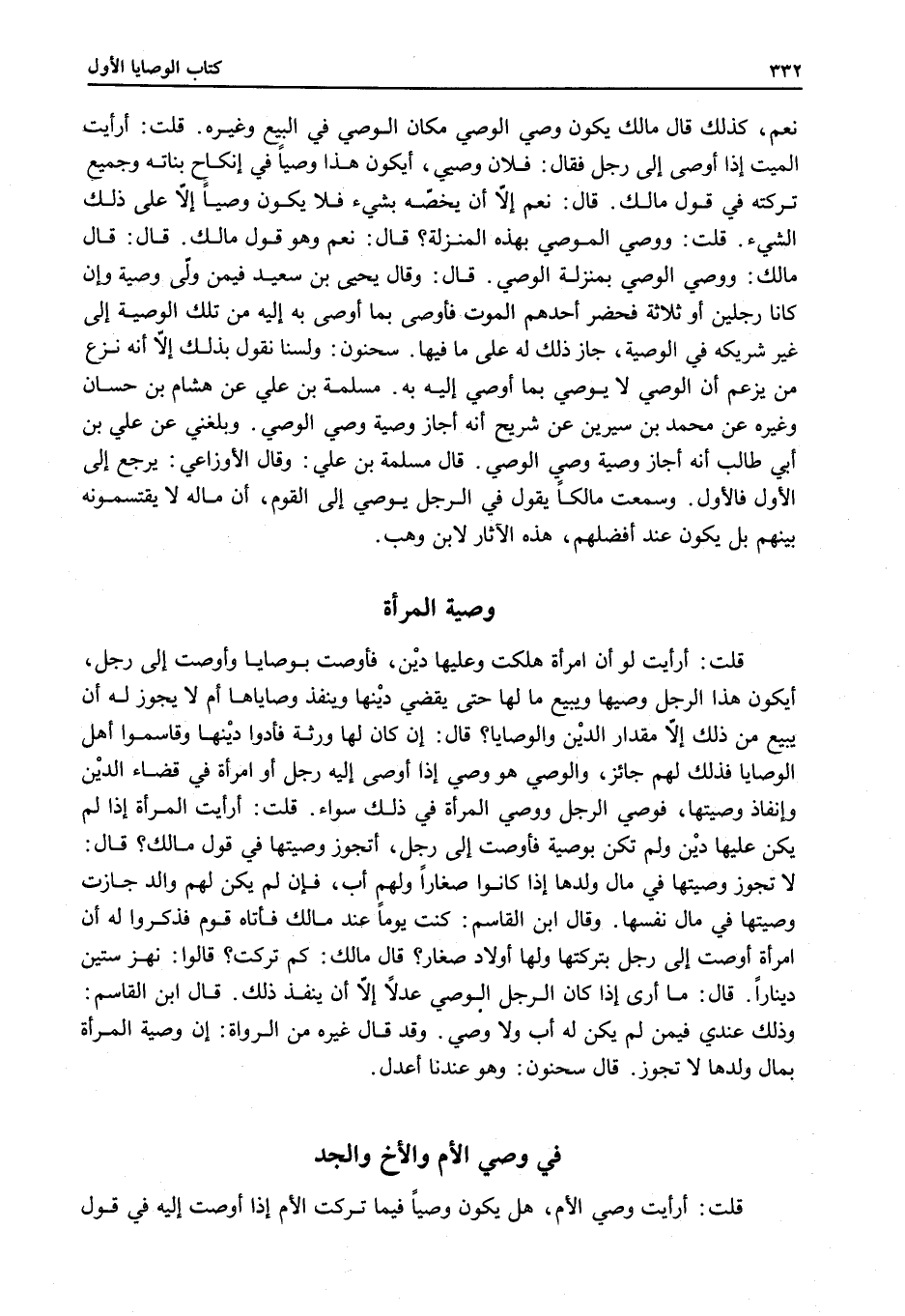 قَالَ ابْنُ الْقَاسِمِ: وَذَلِكَ عِنْدِي فِيمَنْ لَمْ يَكُنْ لَهُ أَبٌ وَلَا وَصِيٌّ. وَقَدْ قَالَ غَيْرُهُ مِنْ الرُّوَاةِ: إنَّ وَصِيَّةَ الْمَرْأَةِ بِمَالِ وَلَدِهَا لَا تَجُوزُ.