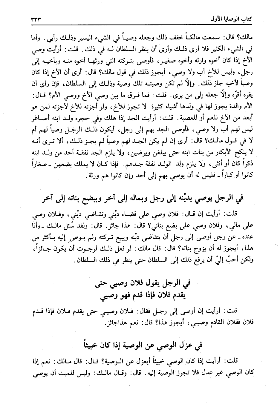 قَالَ: سَمِعْتُ مَالِكًا خَفَّفَ ذَلِكَ وَجَعَلَهُ وَصِيًّا فِي الشَّيْءِ الْيَسِيرِ وَذَلِكَ رَأْيِي. أَمَّا فِي الشَّيْءِ الْكَثِيرِ فَلَا أَرَى ذَلِكَ وَأَرَى أَنْ يَنْظُرَ السُّلْطَانُ لَهُ فِي ذَلِكَ.